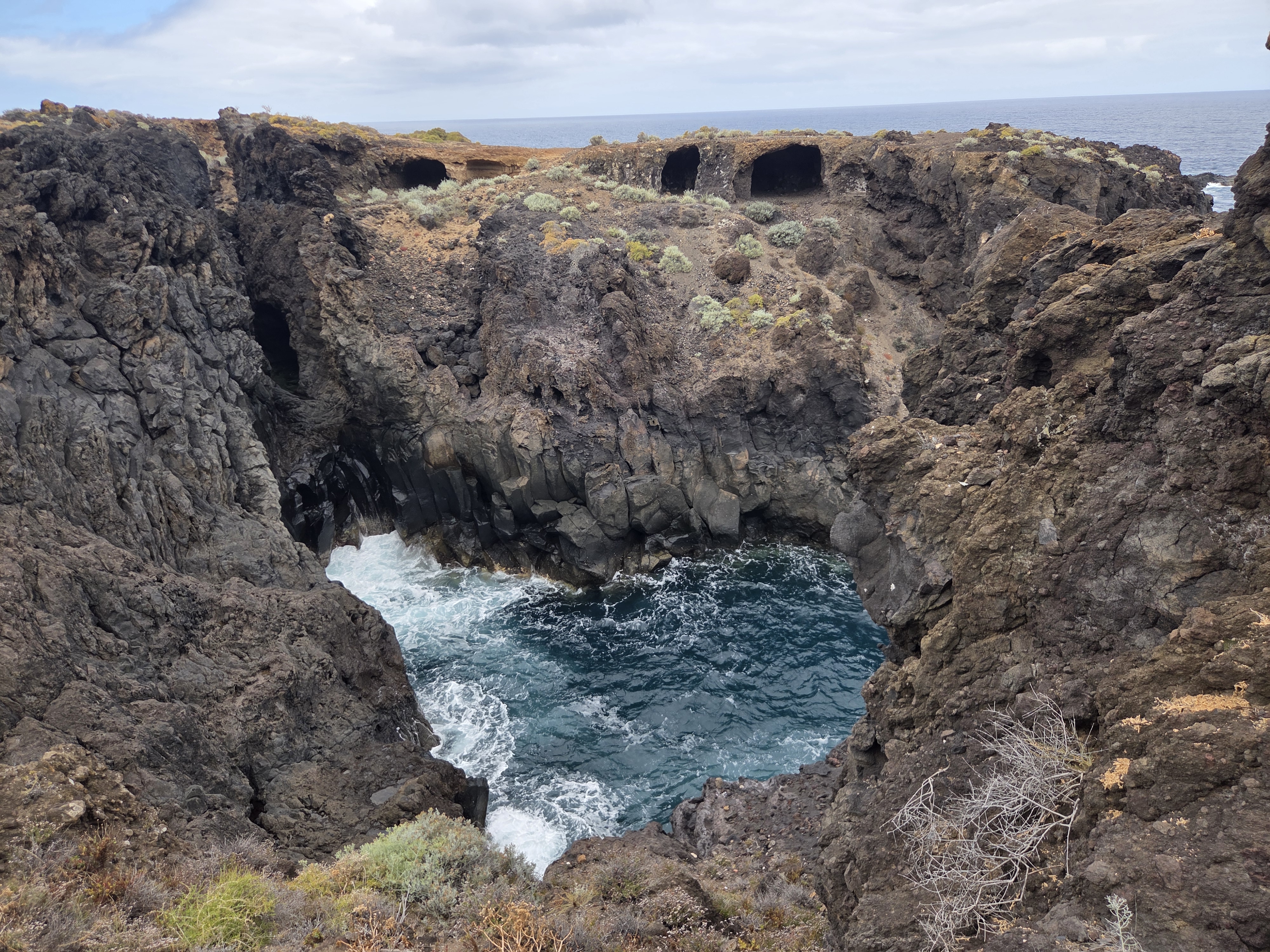 La geología marca el ritmo de la costa: tubos, diques y columnas basálticas crean huecos y calderas que, al llenarse con el oleaje, forman charcos naturales.