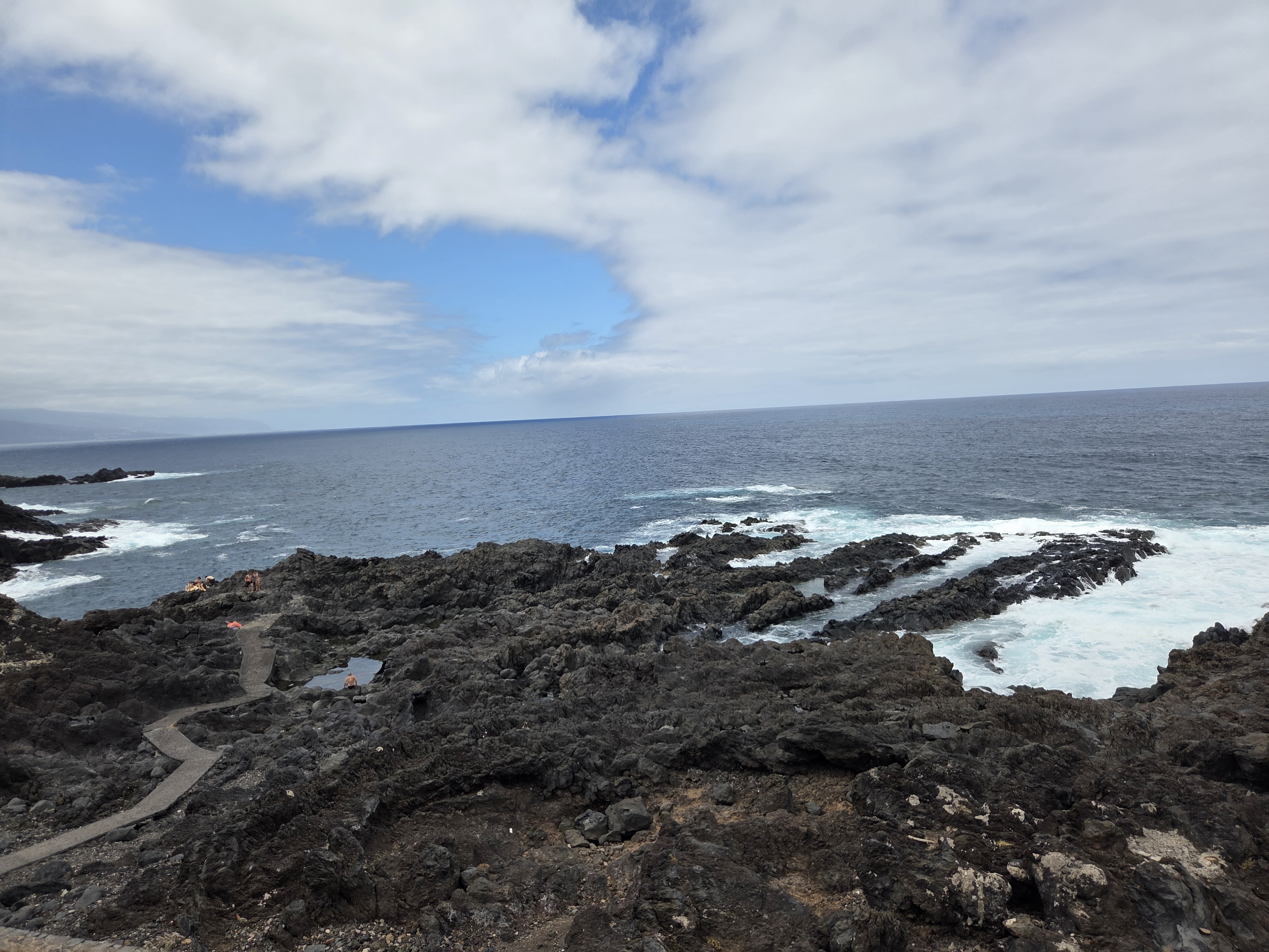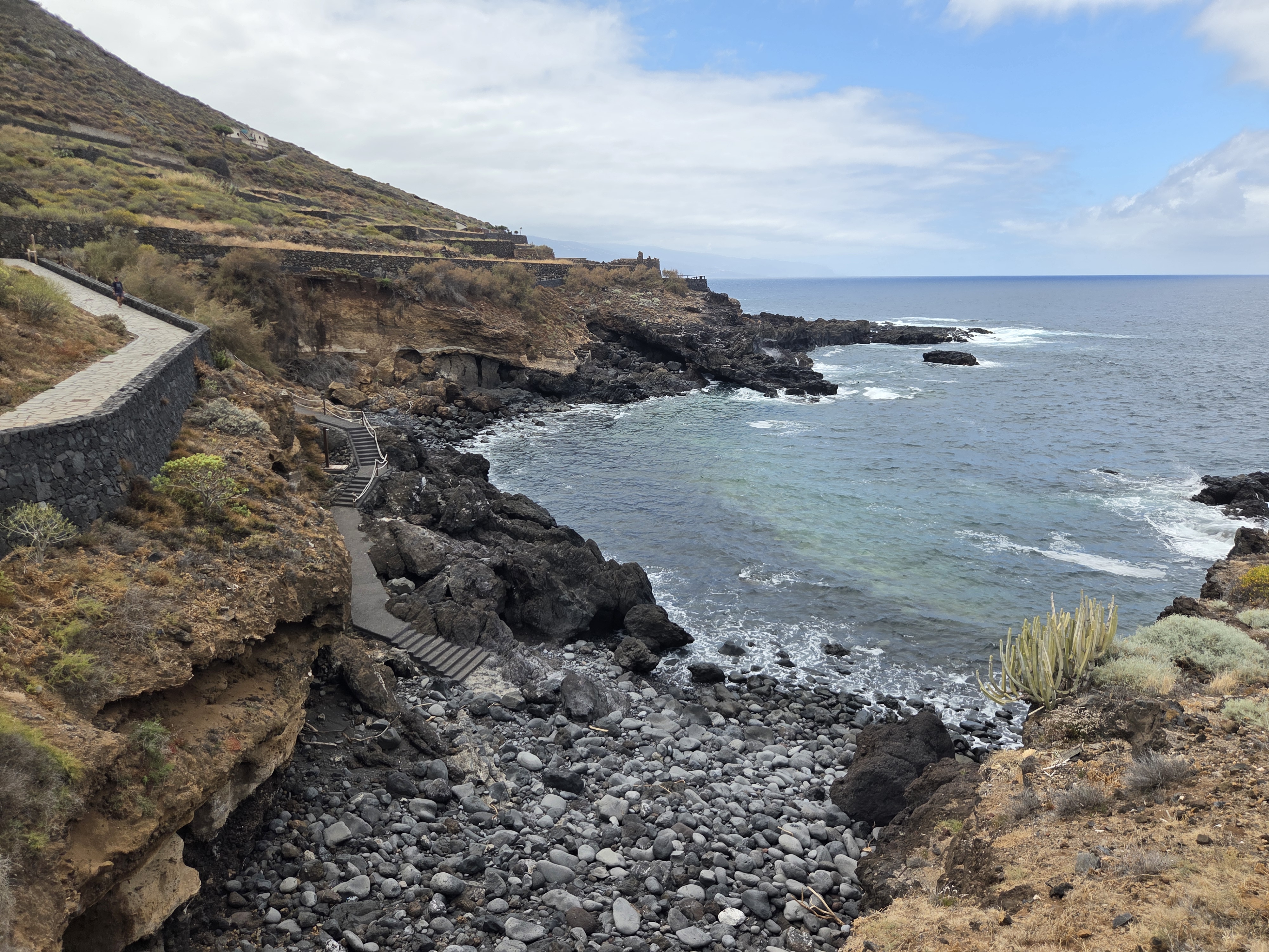 Junto al mar aparece una plataforma de toba con pequeñas cavidades y un paseo perimetral que facilita la observación del oleaje.