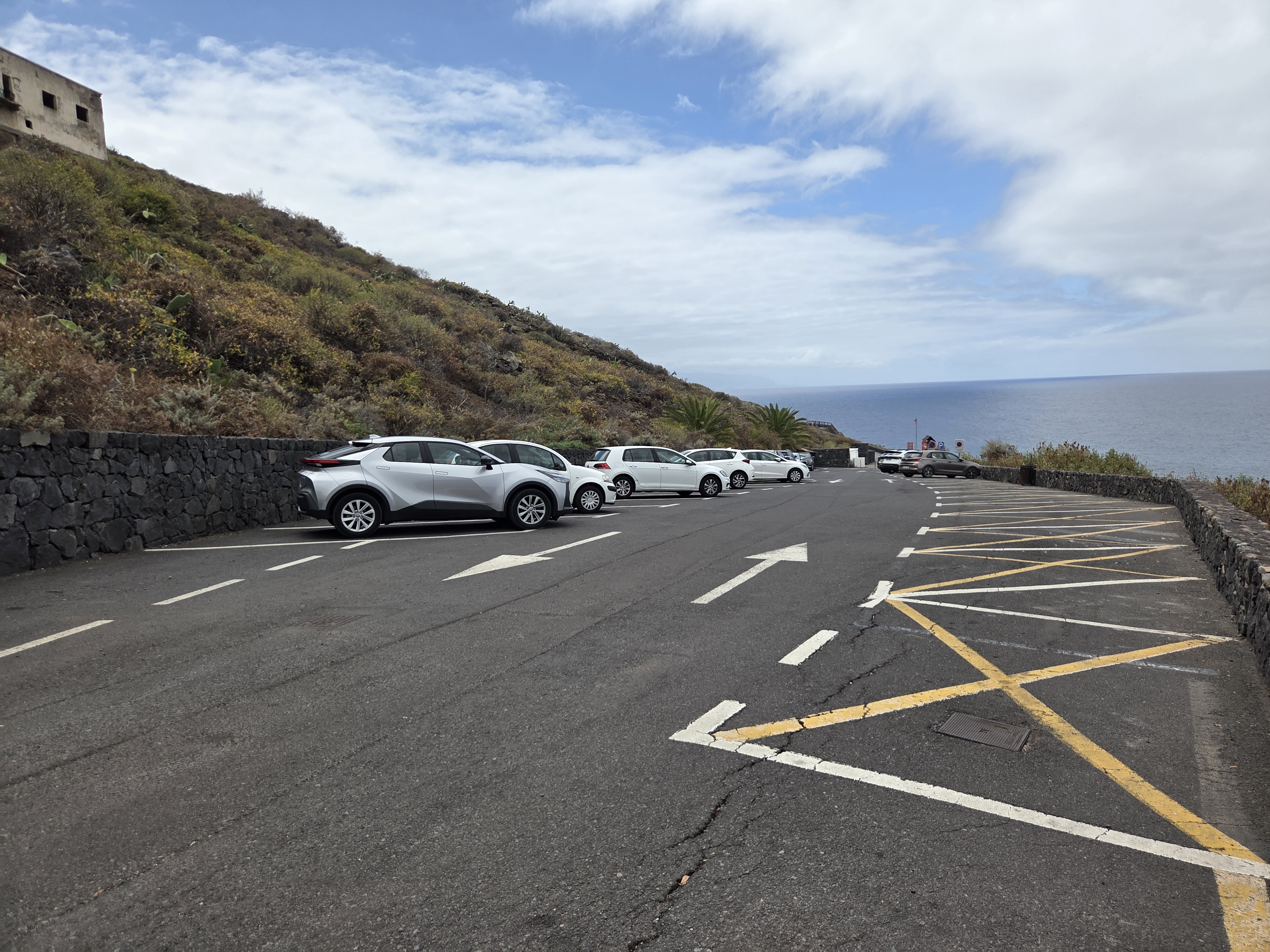 El acceso principal dispone de un aparcamiento amplio en la cota alta; desde aquí comienza la bajada pavimentada hacia el litoral.