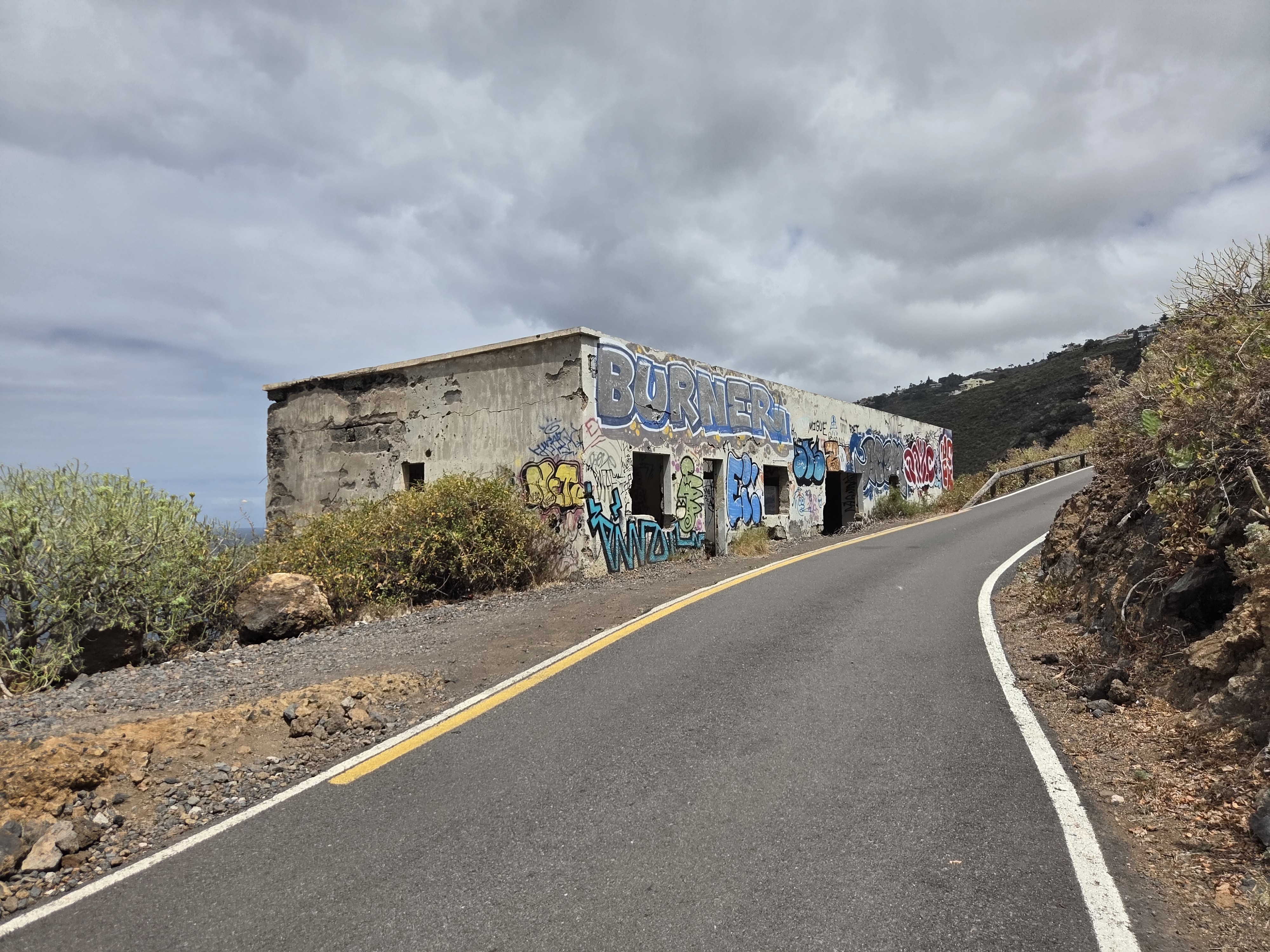 Junto a la carretera aparece una construcción en ruinas cubierta de grafitis, testimonio de la actividad humana en la zona costera.