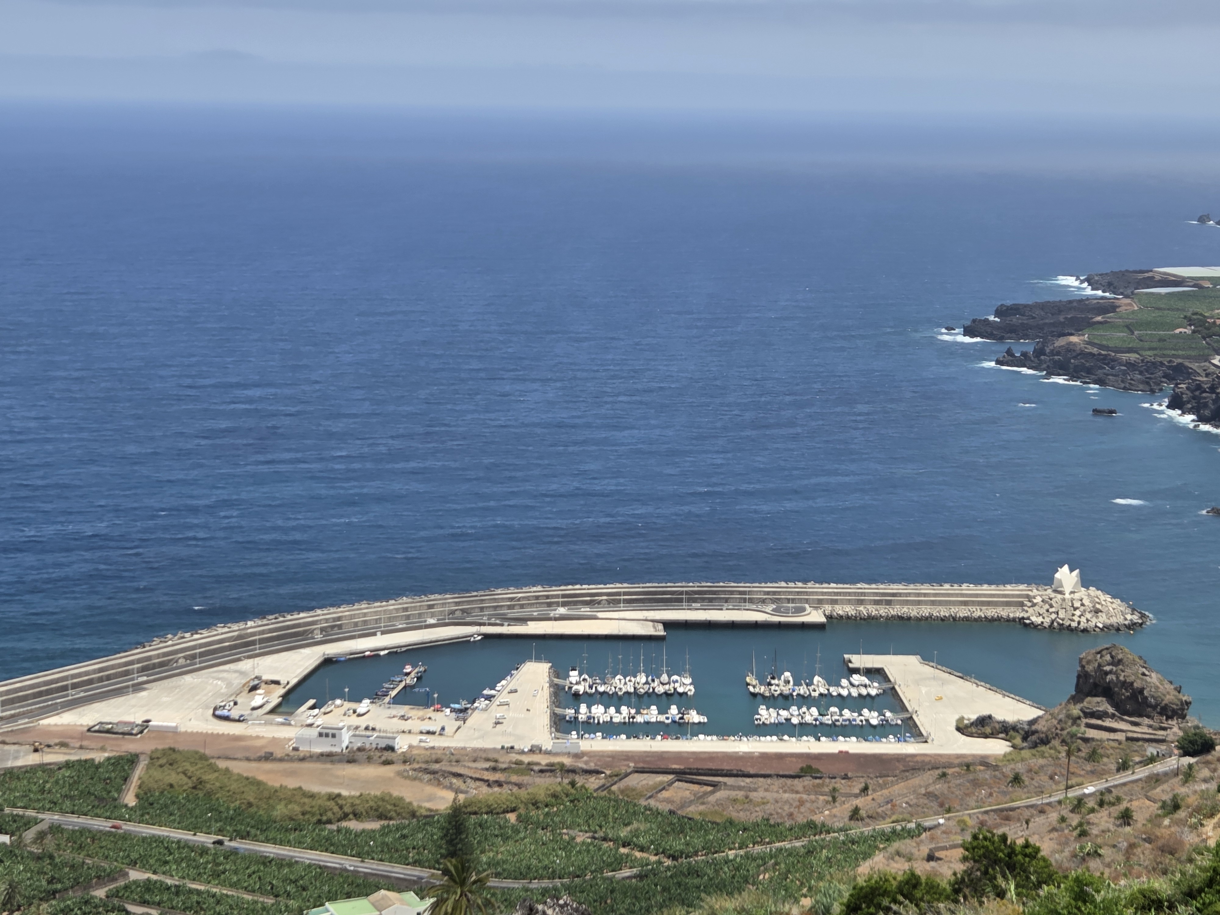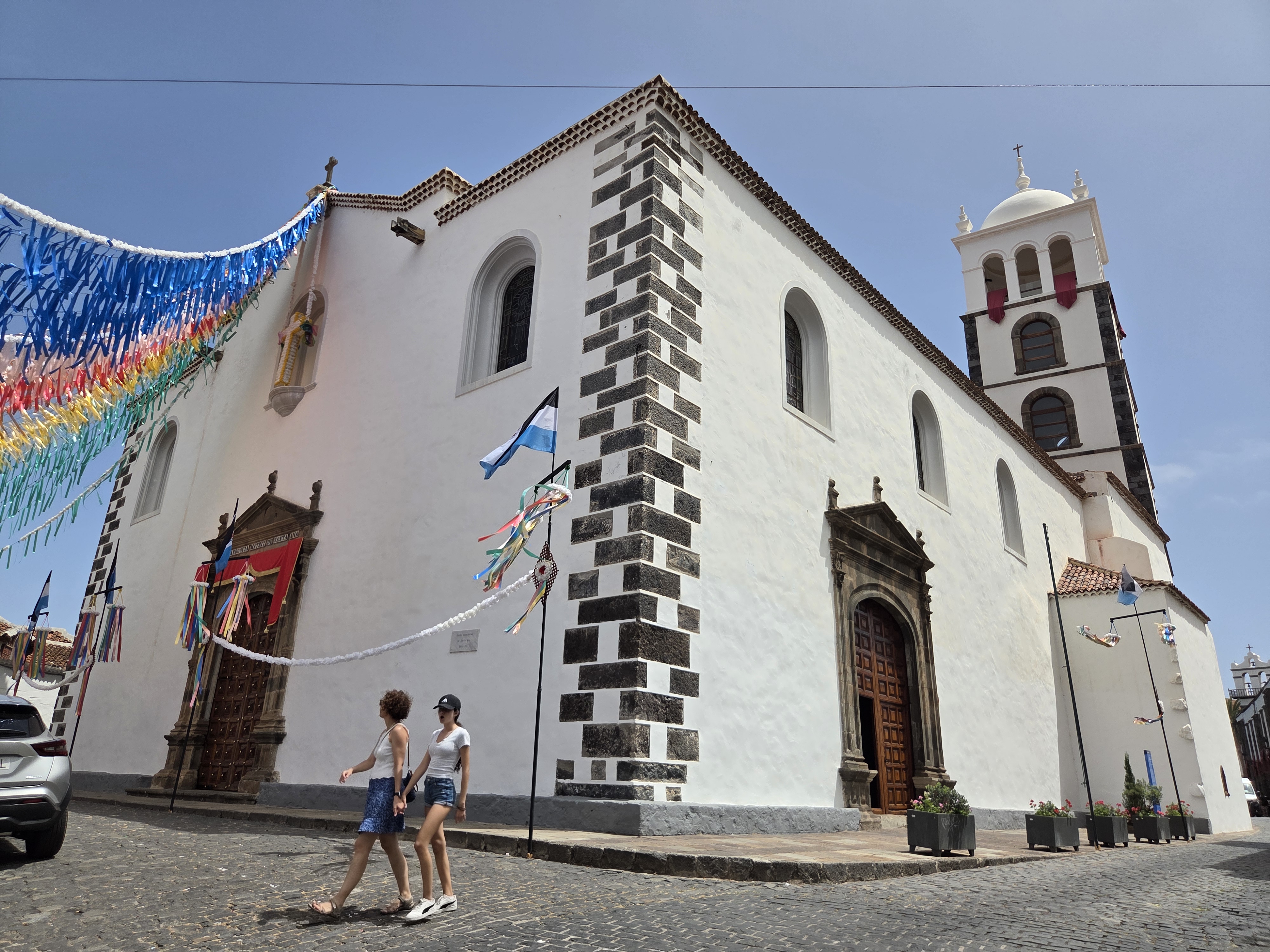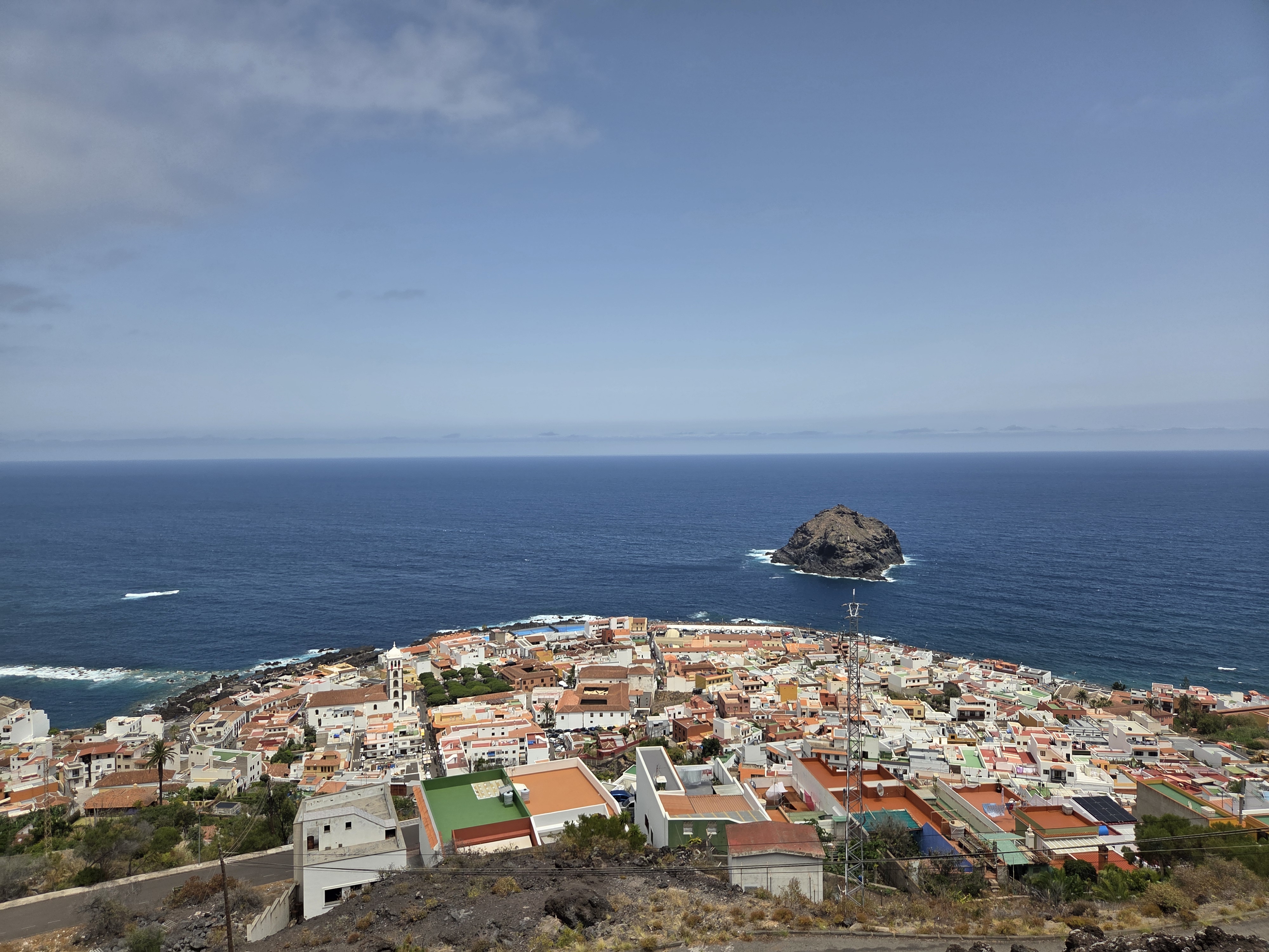 Comenzamos con una panorámica que sitúa el pueblo entre el Atlántico y las laderas volcánicas. La roca aislada frente a la costa —el famoso Roque de Garachico— domina el horizonte y ayuda a comprender la forma del litoral.