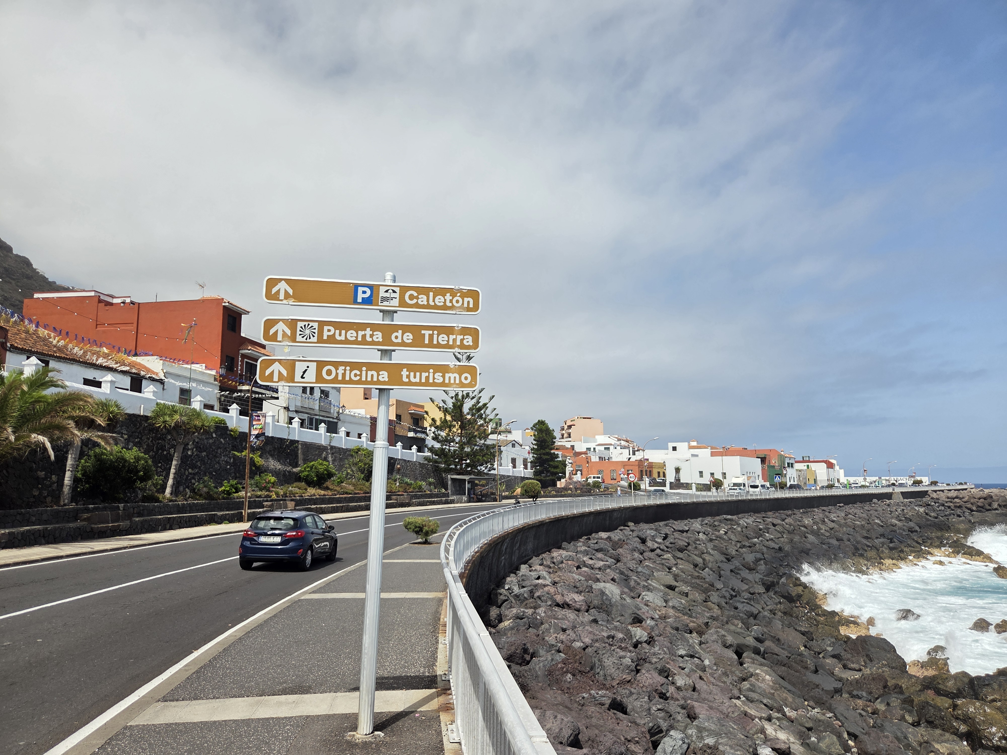 La señalización turística marrón indica servicios clave: aparcamiento del Caletón, la Puerta de Tierra y la oficina de turismo junto al paseo costero.