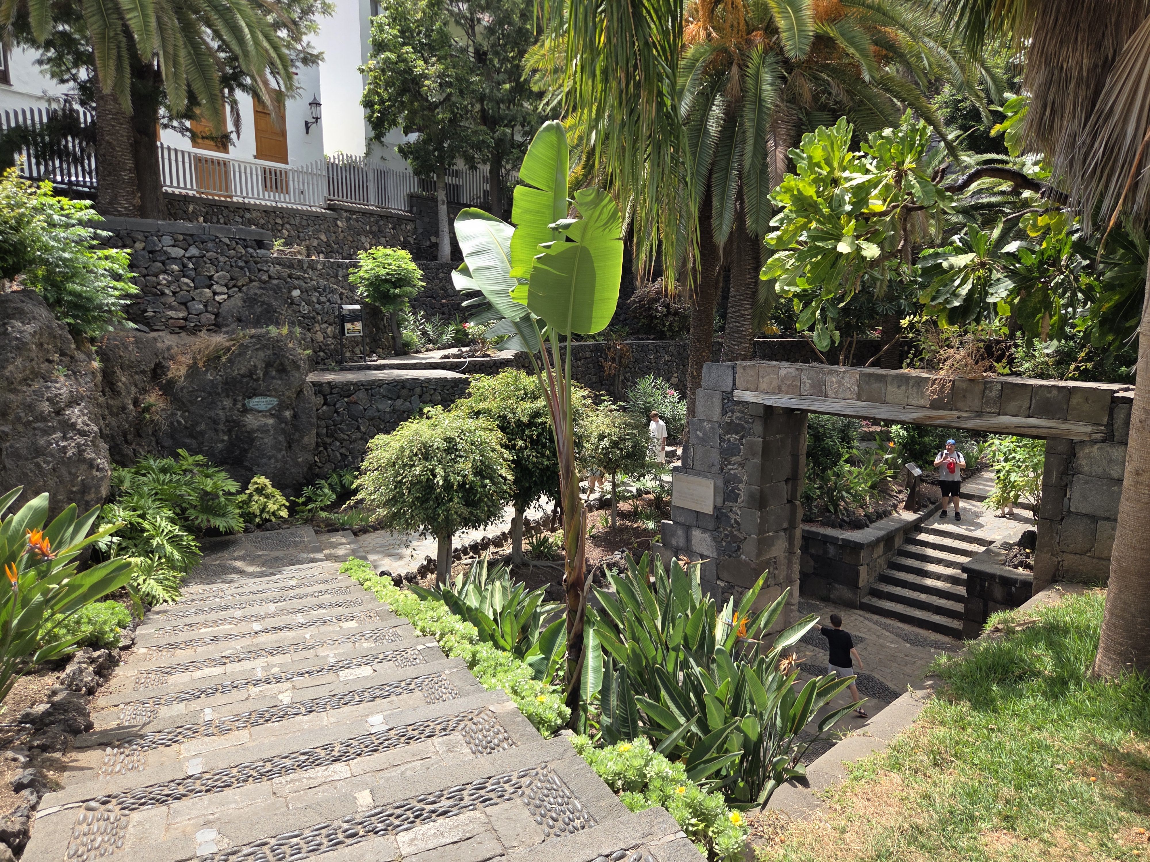 Entre muros de lava y vegetación tropical se abre un parque escalonado con escaleras de canto rodado: un respiro verde en pleno centro.