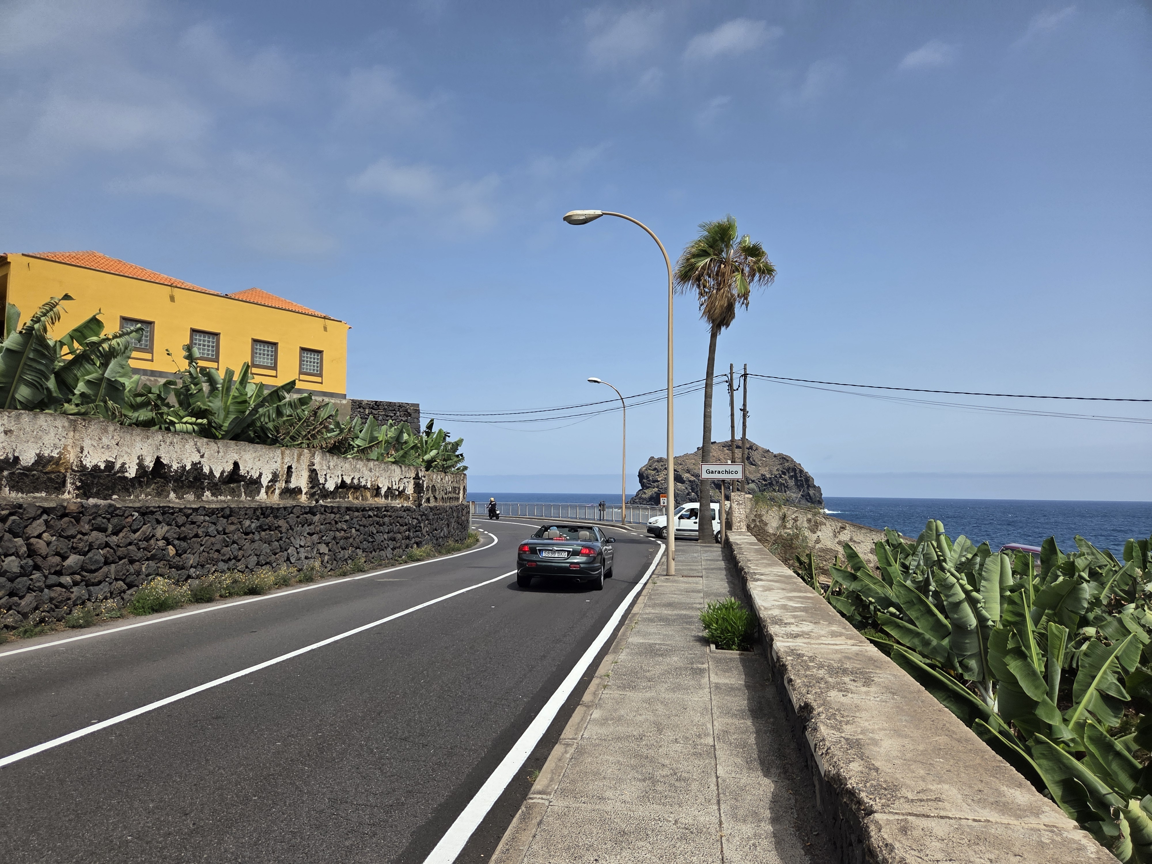 Desde la carretera de entrada se obtienen vistas abiertas del litoral, con plataneras y el Roque recortado sobre el mar.