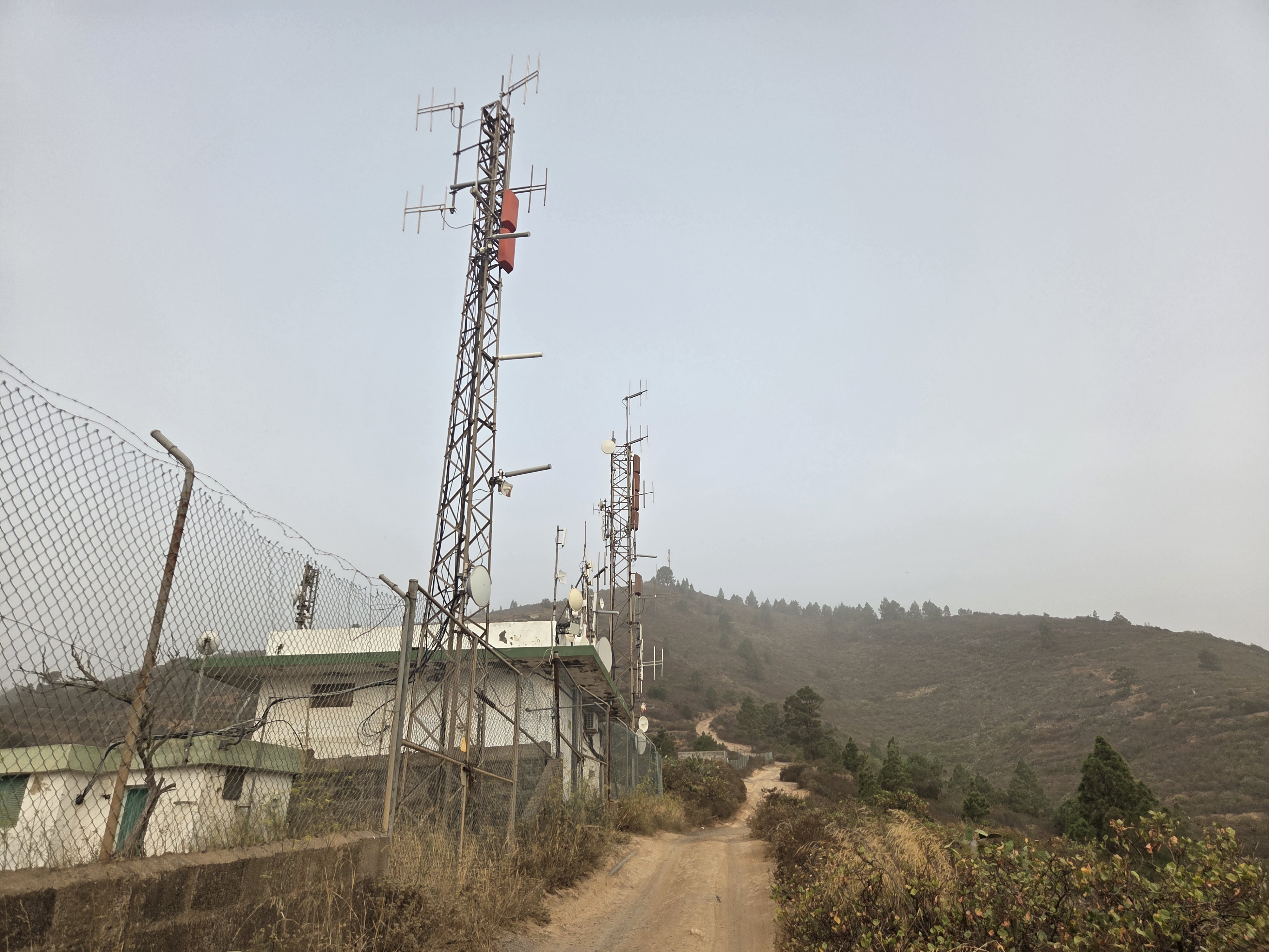 La pista de acceso bordea un conjunto de antenas y repetidores, referencia visible desde lejos.
