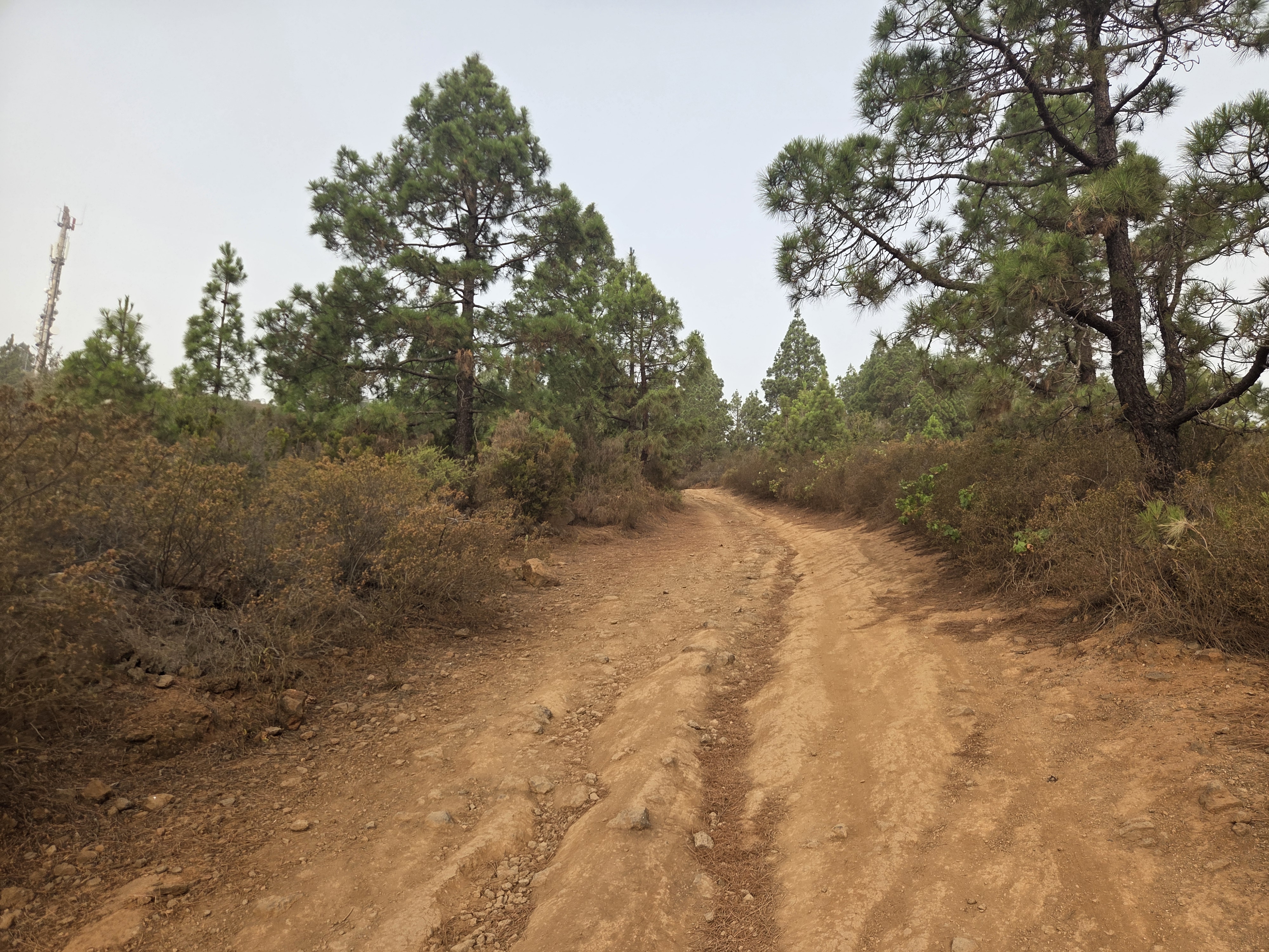 La aproximación discurre por pistas forestales cómodas entre pinos y cipreses, donde es fácil avanzar y orientarse.