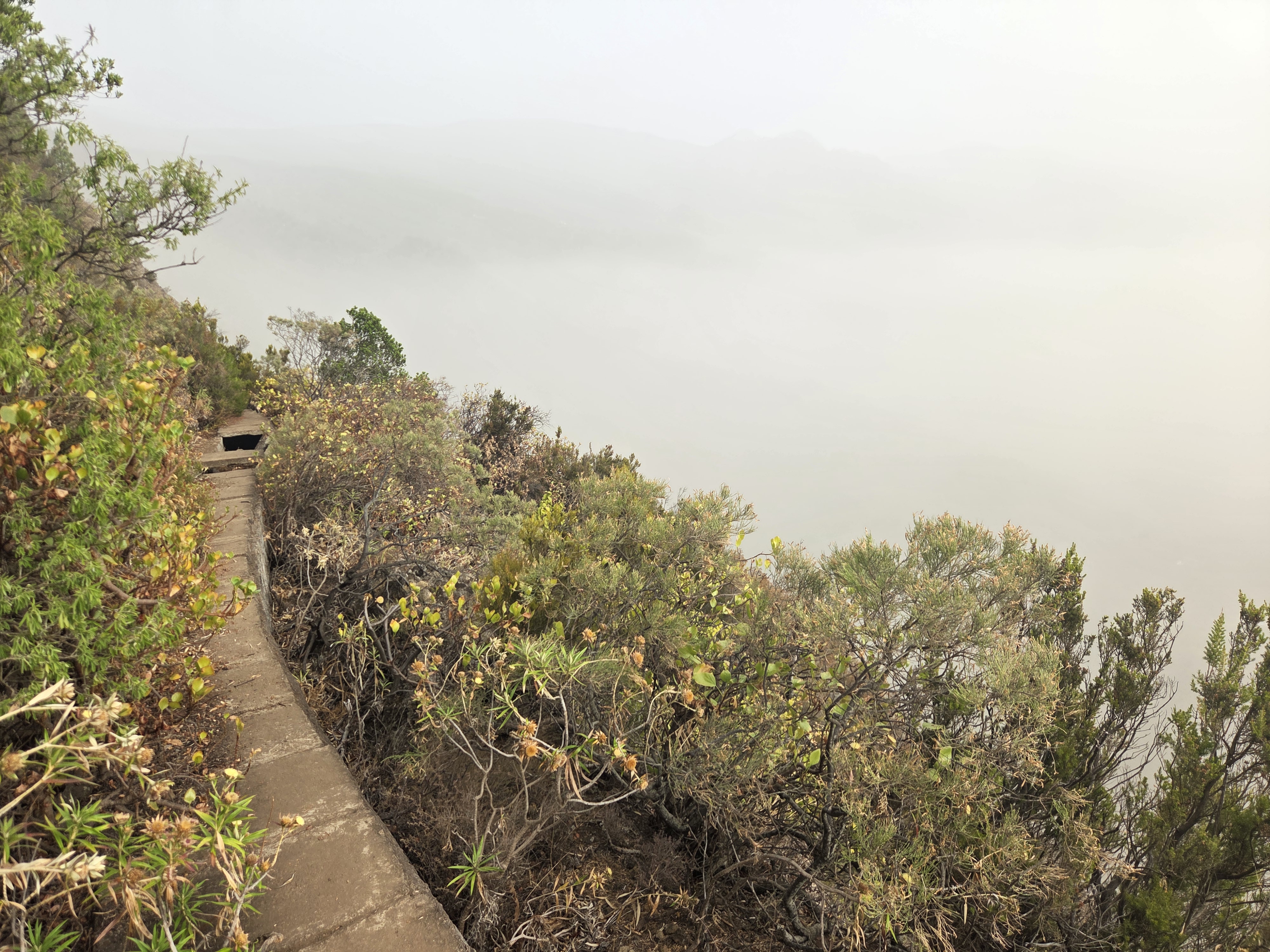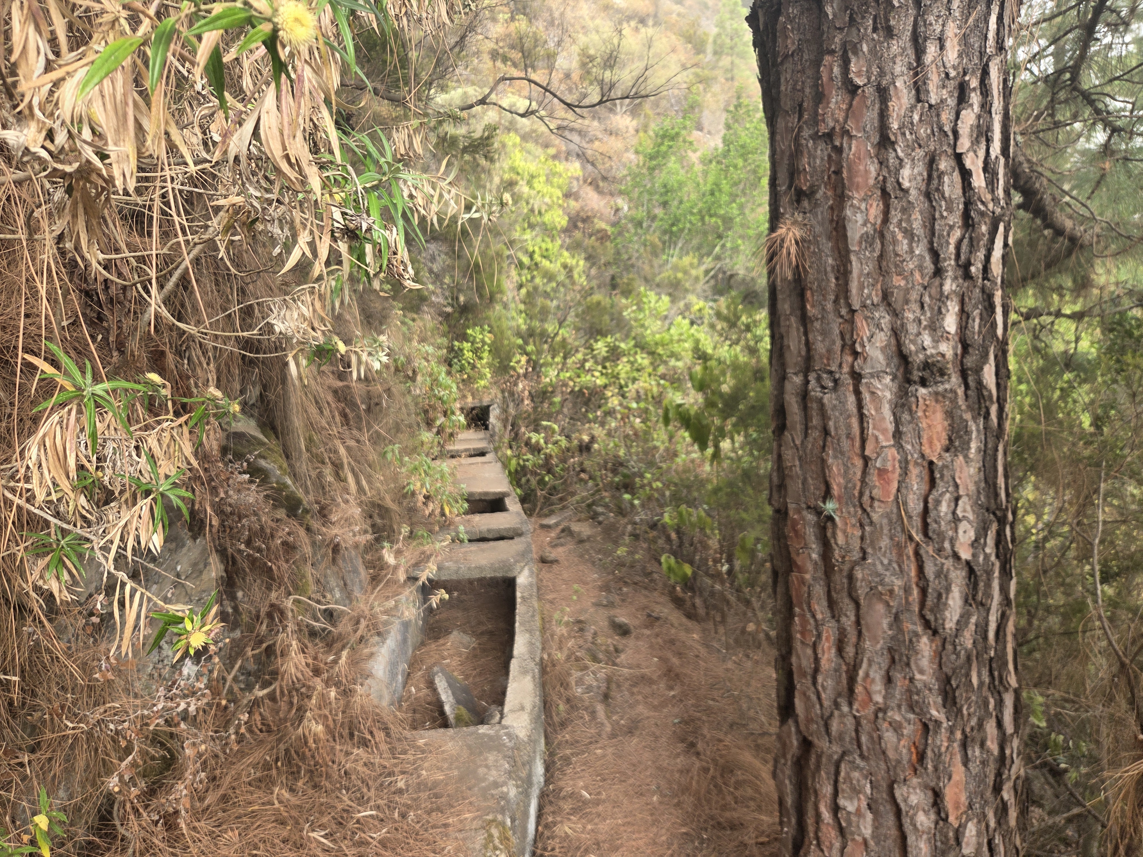 El tramo más característico es el del canal de hormigón excavado en la ladera. La senda discurre literalmente sobre su borde, con fuerte caída al valle.