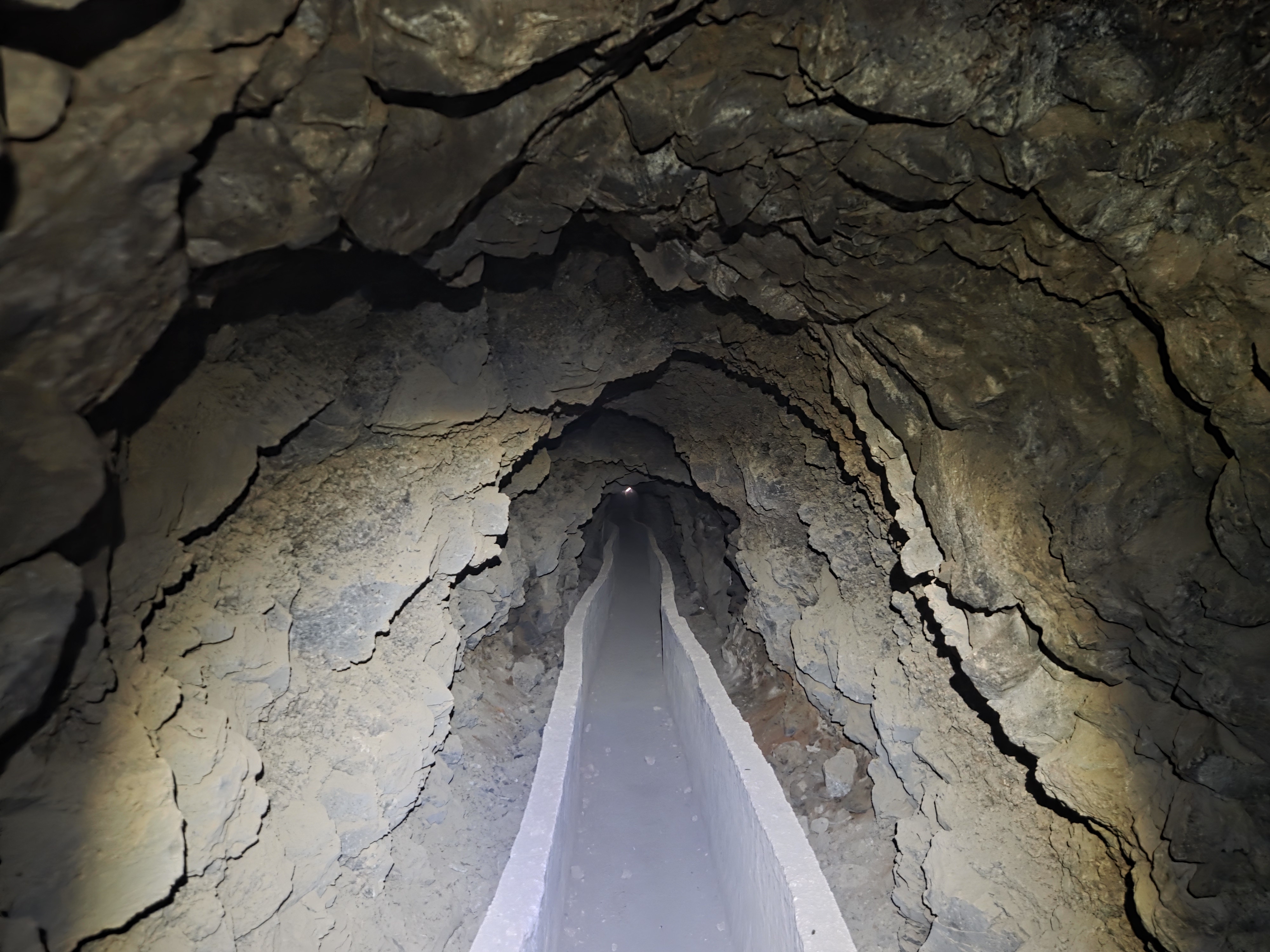 En el interior se observa la canaleta central y las paredes volcánicas que sostienen el pasadizo.