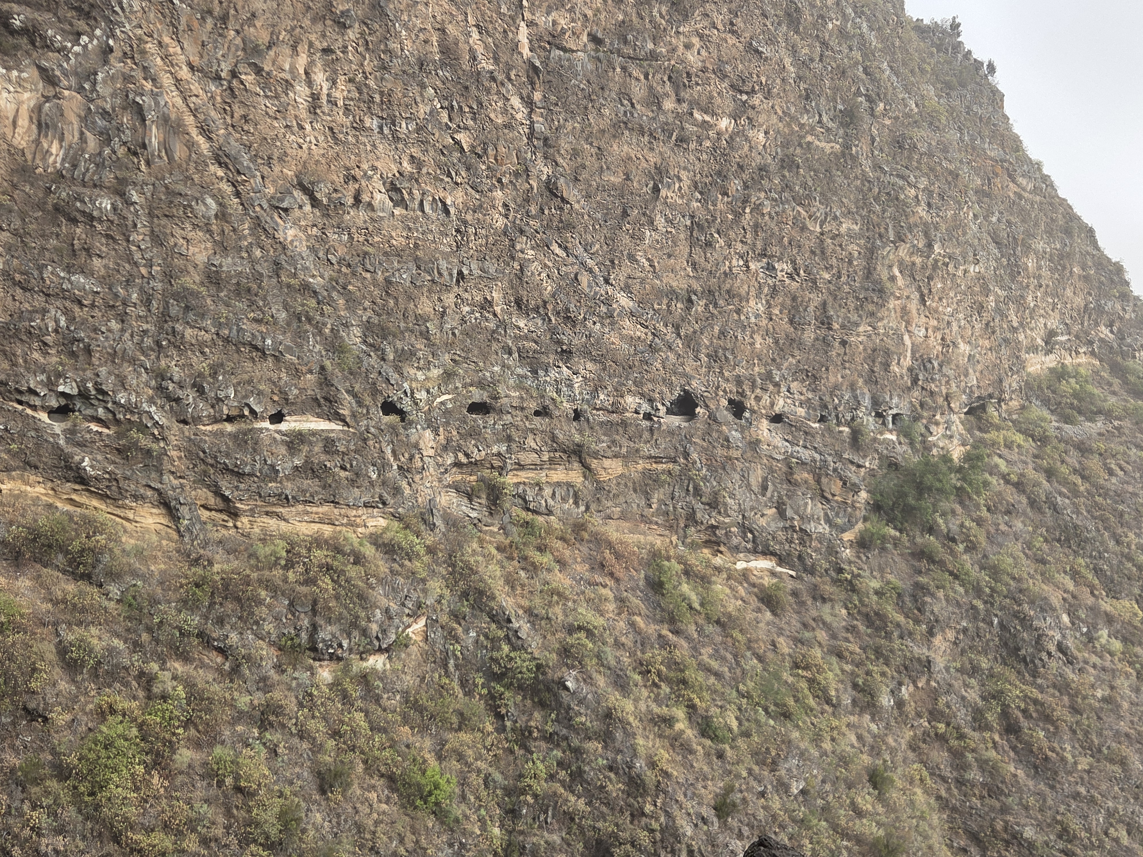 Desde el exterior se aprecia la traza del sendero a media altura y la sucesión de pequeñas aberturas en la pared.