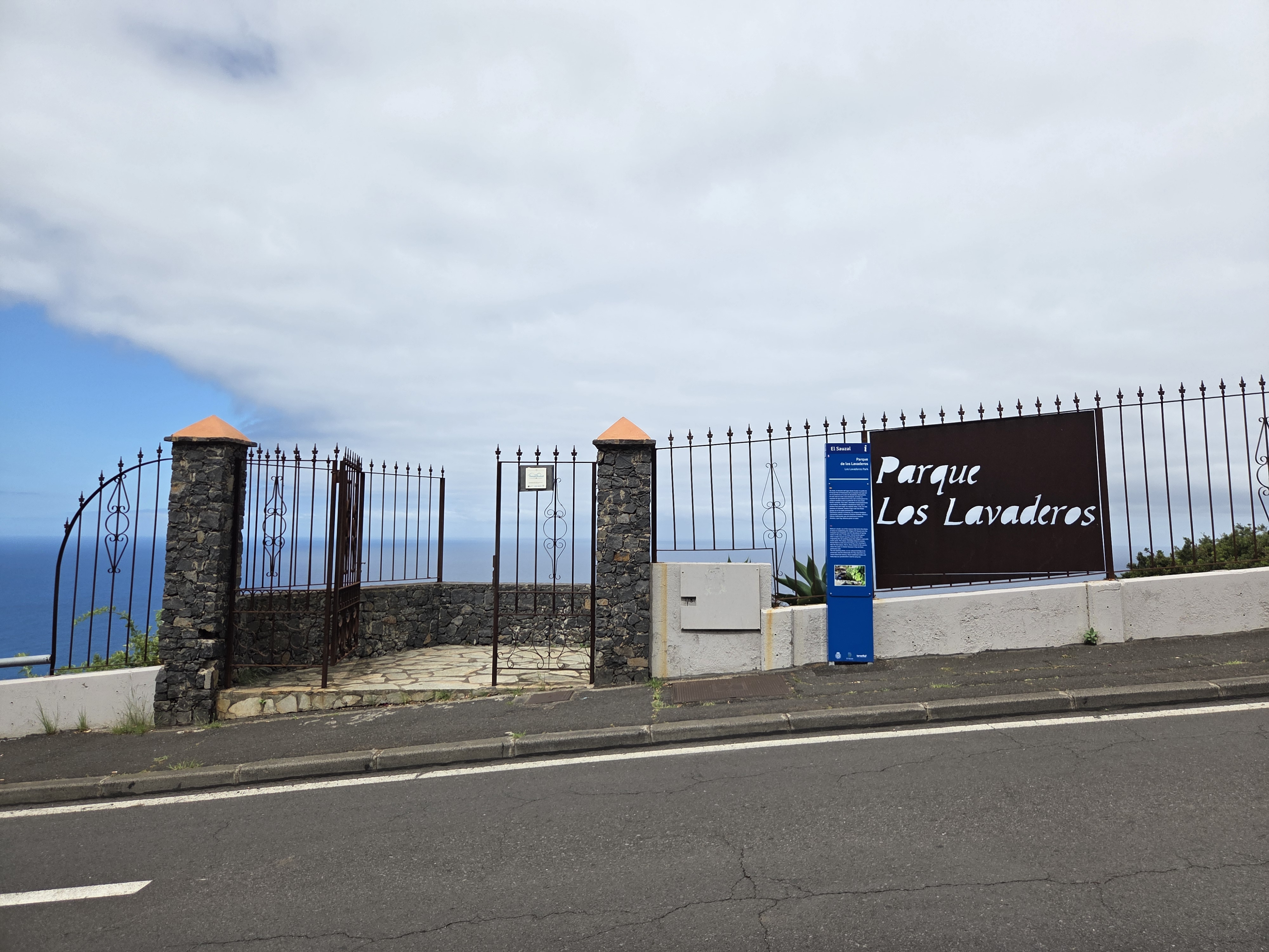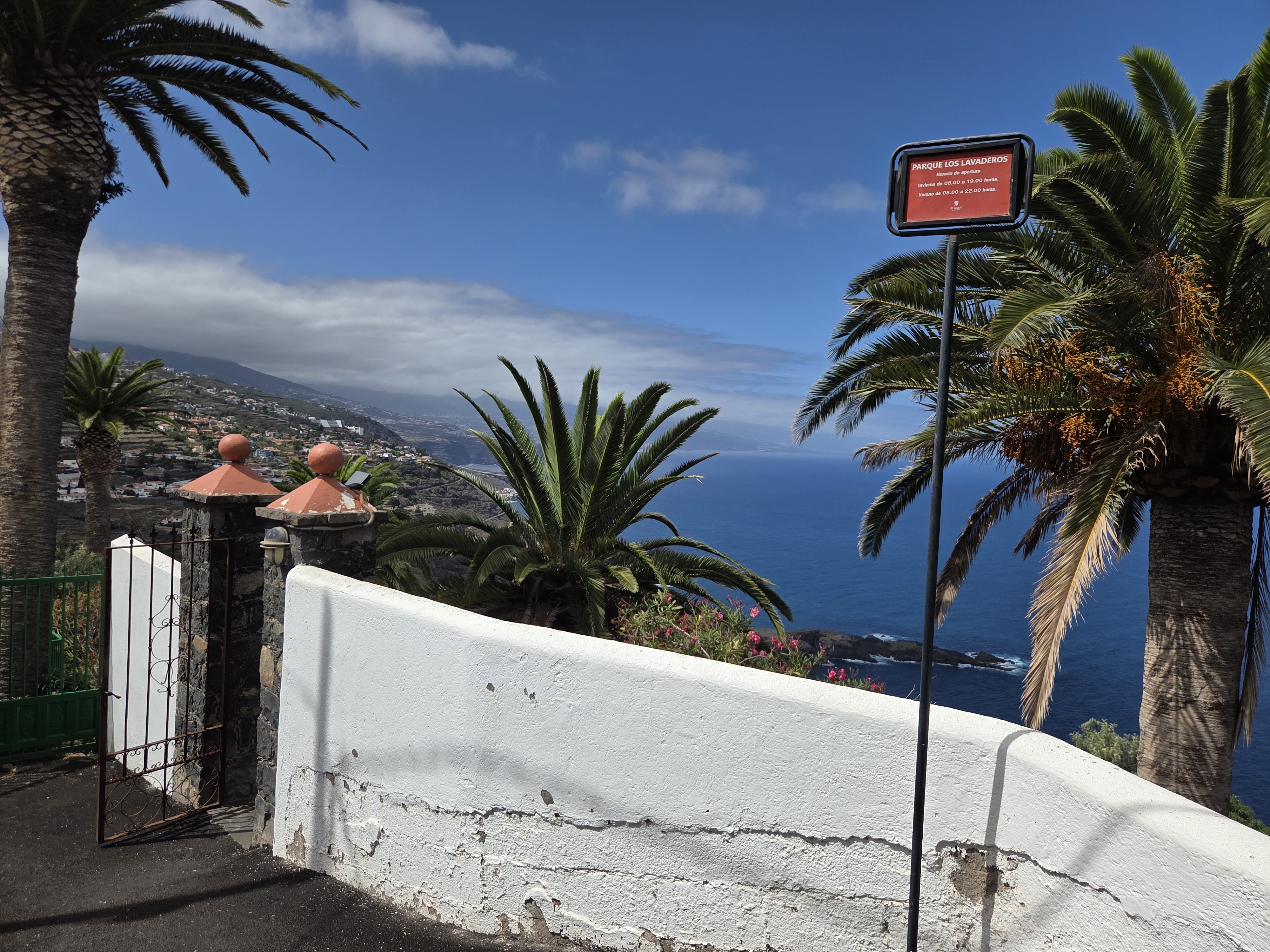 El parque cuenta con distintos puntos de acceso señalizados. Las puertas de forja y los pilares de piedra volcánica introducen el lenguaje arquitectónico del lugar, integrado en el paisaje del acantilado.
