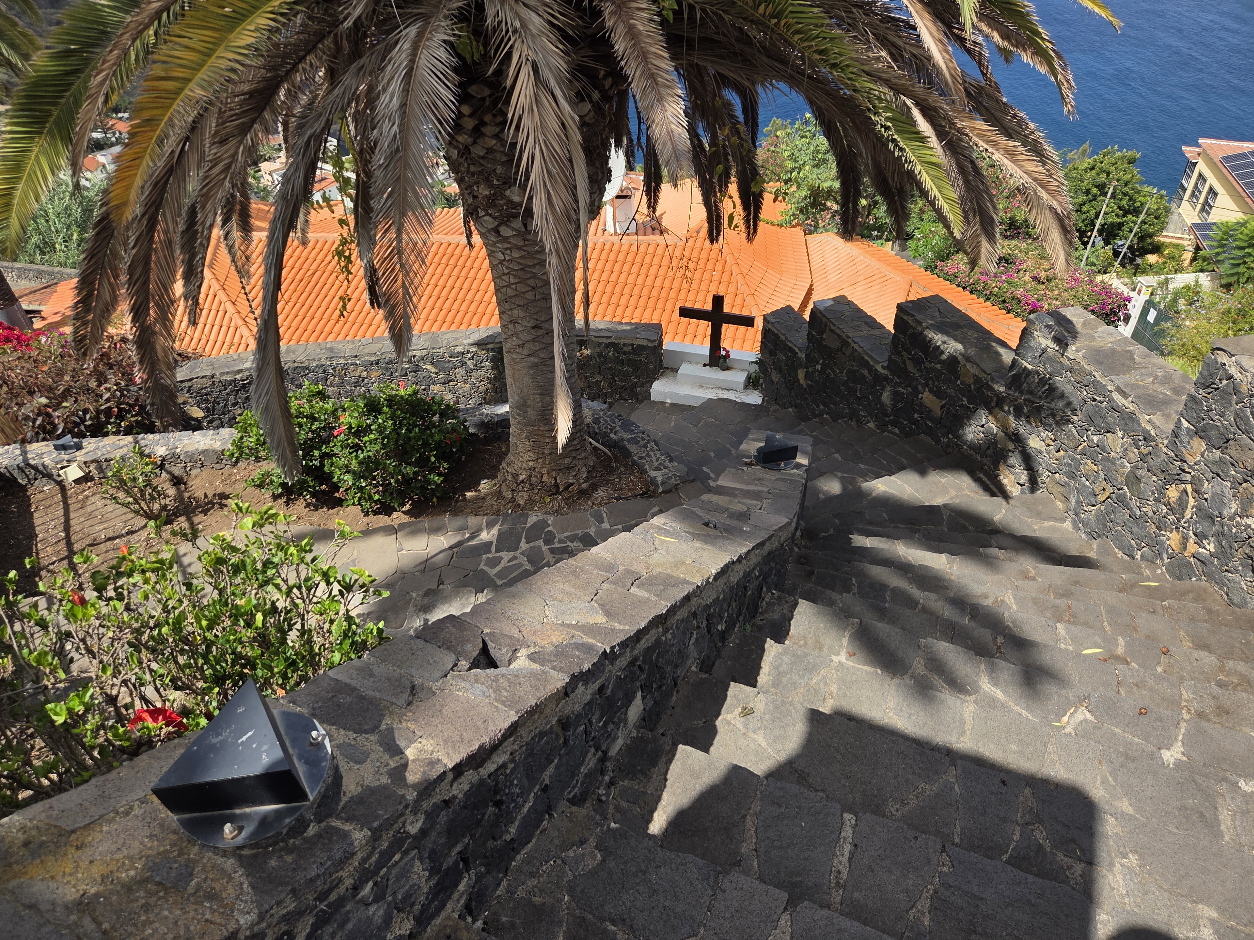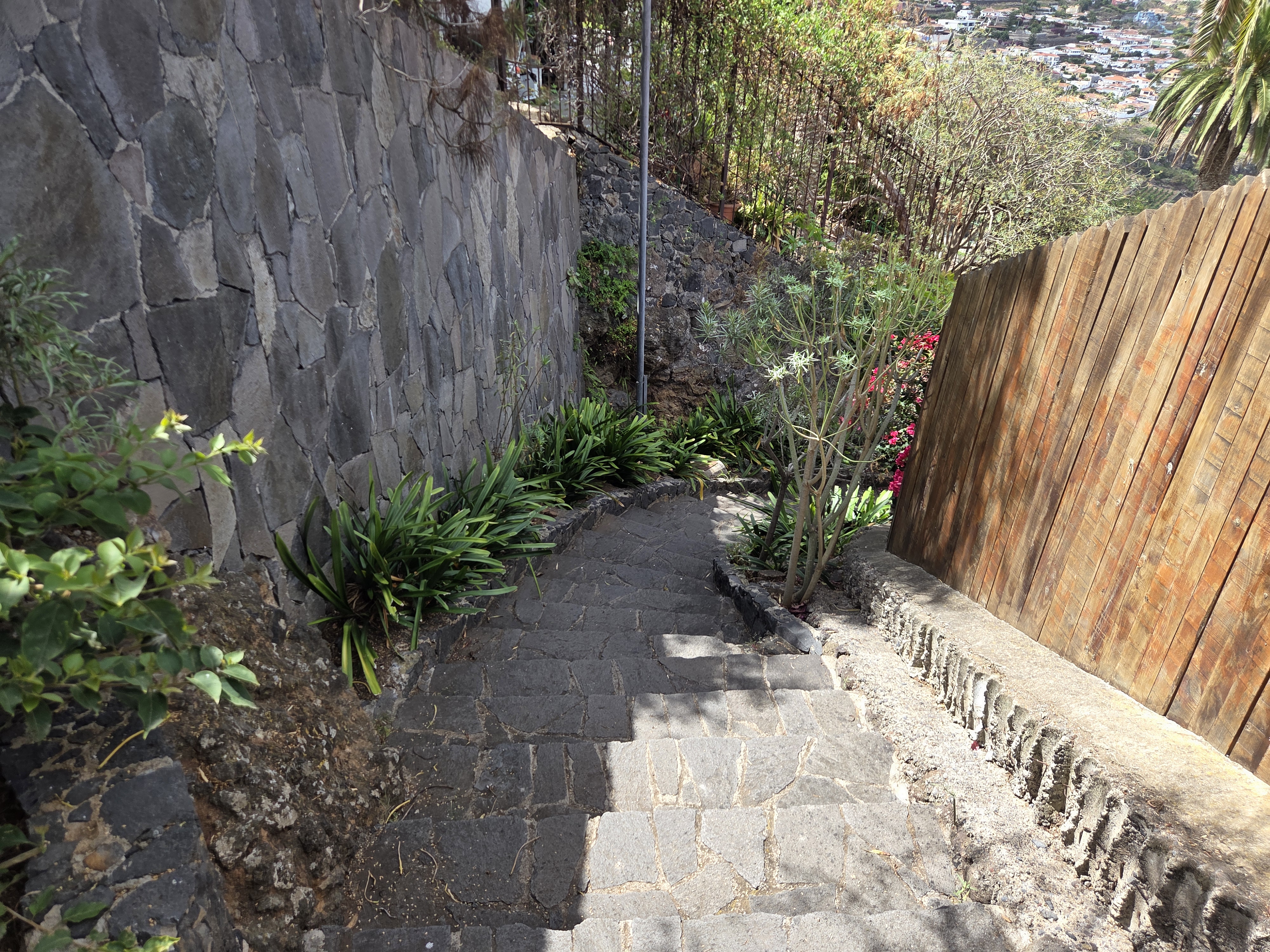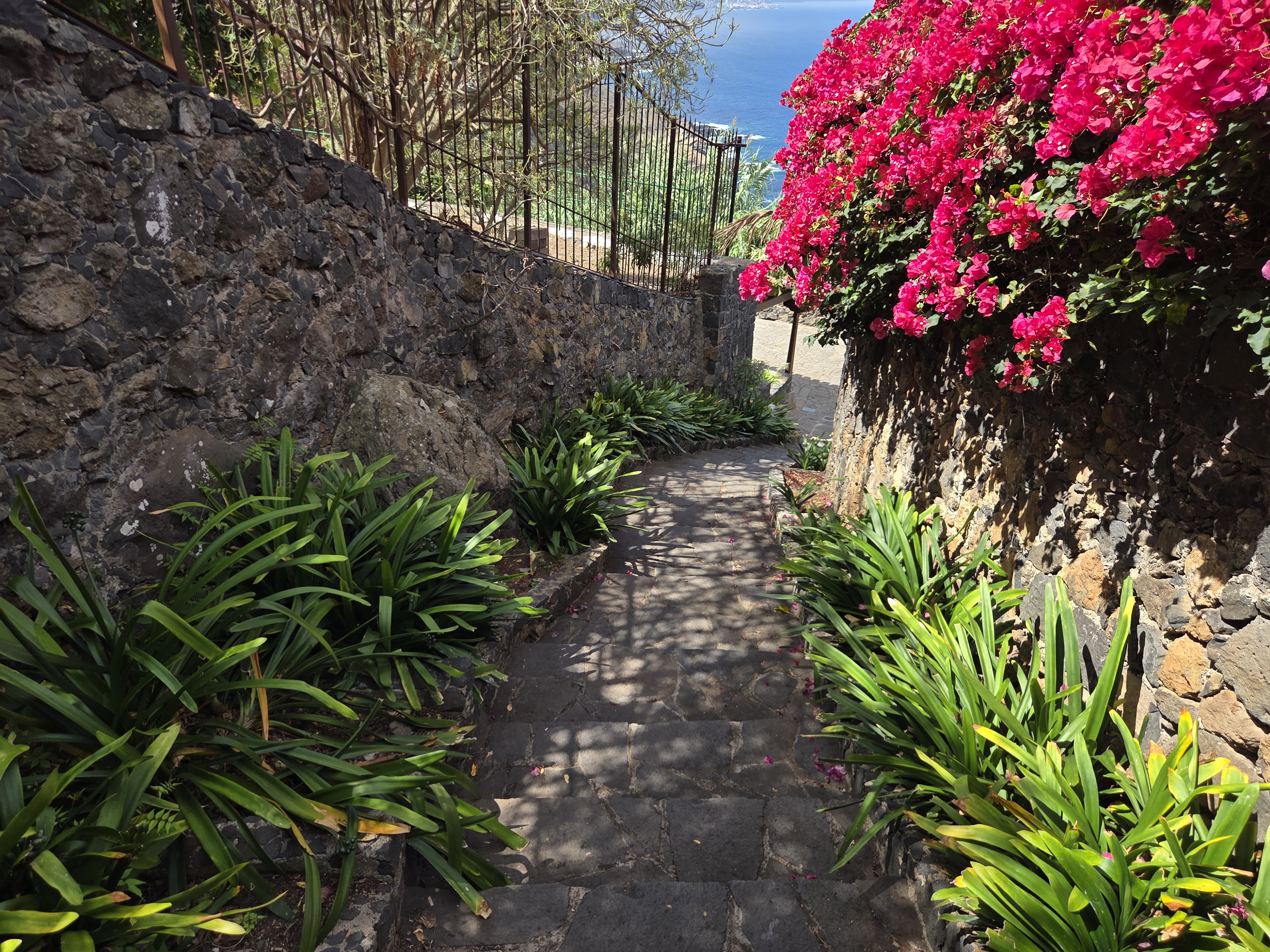 El recorrido desciende por escalinatas empedradas que serpentean entre muros y jardines. Cada tramo ofrece diferentes encuadres: pasillos estrechos, rincones floridos y pequeños descansillos con vistas hacia el mar.