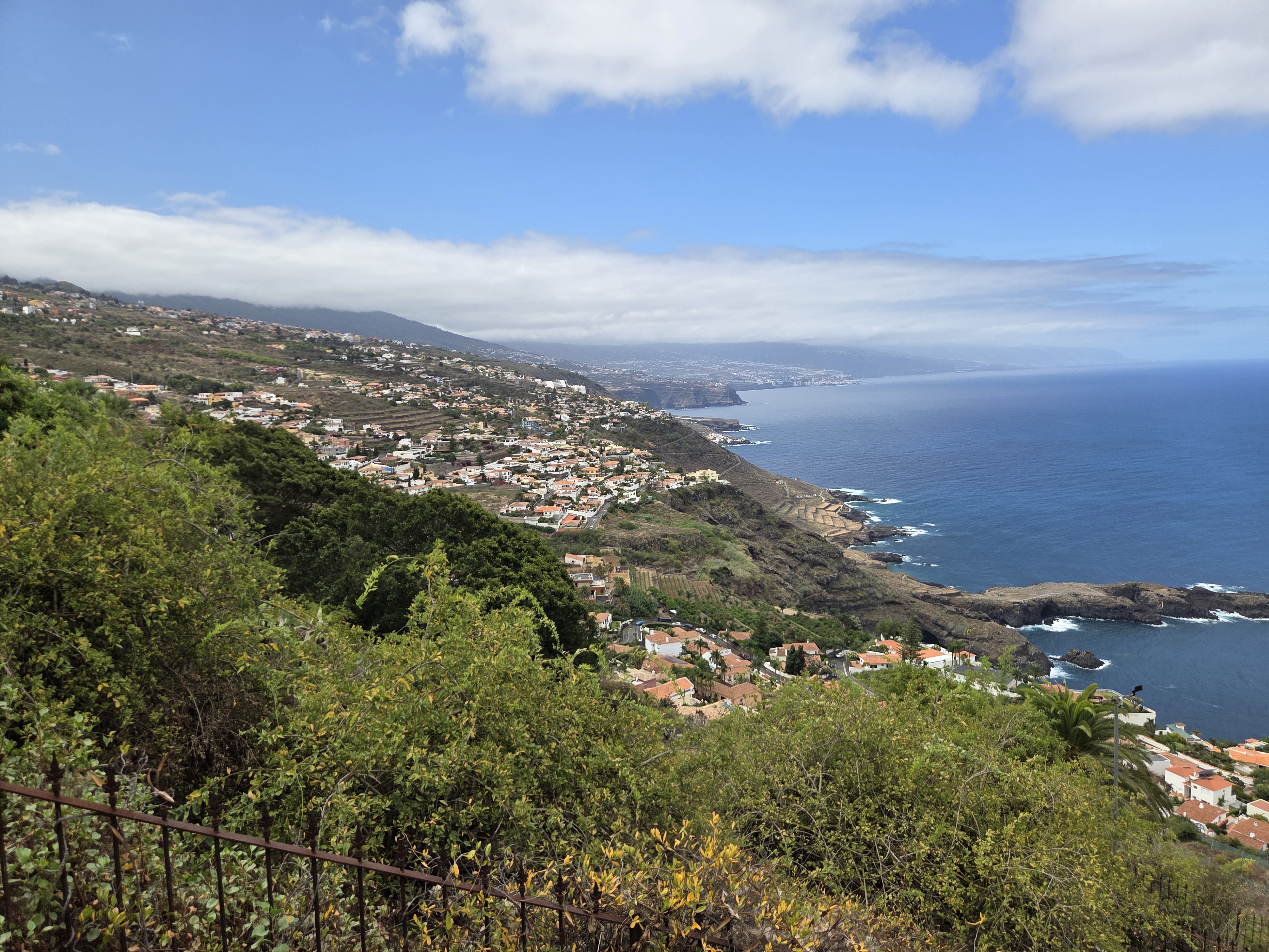 Antes de iniciar el recorrido, nada mejor que una panorámica general del entorno. Desde el parque se domina el tramo de costa que va desde El Sauzal hacia el noreste, con cultivos en terrazas, caserío tradicional y el océano como telón de fondo.