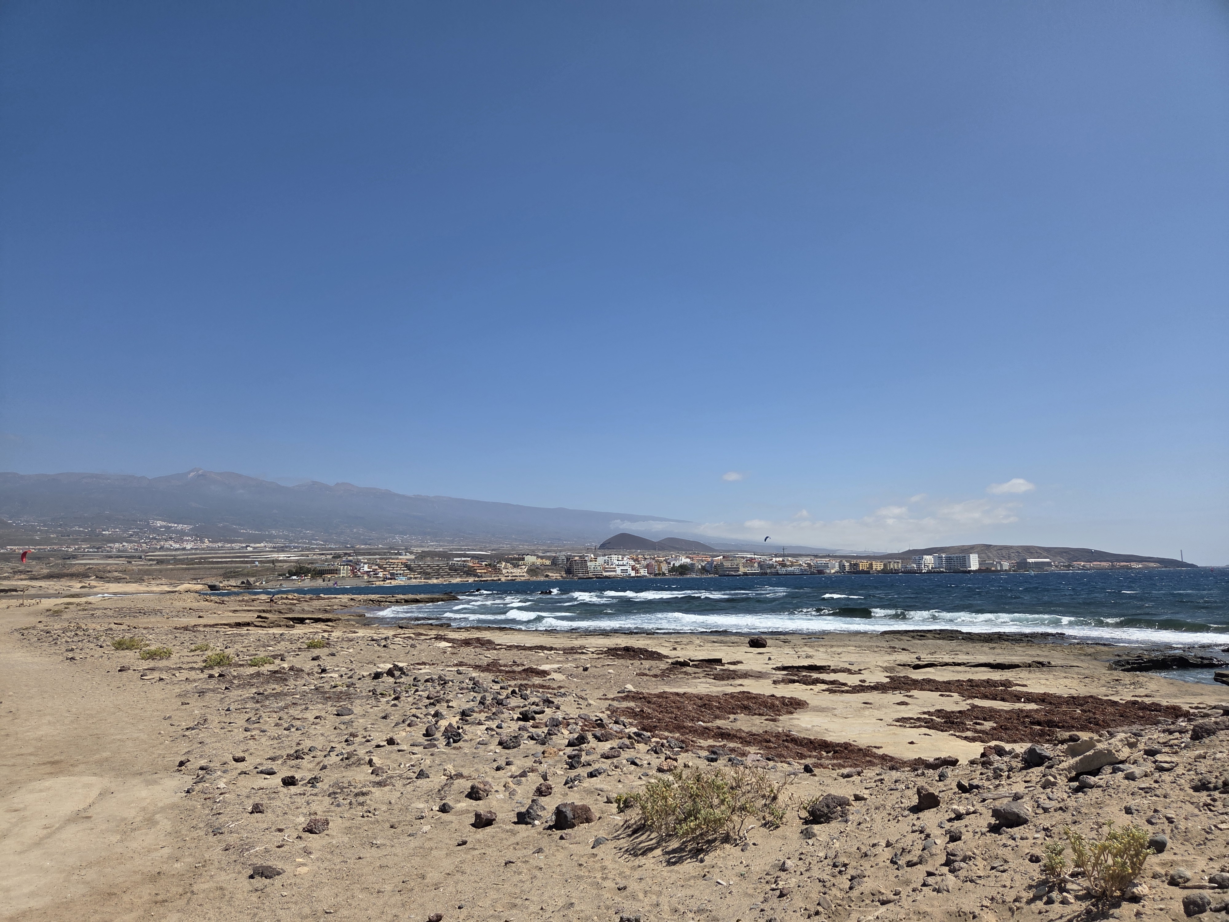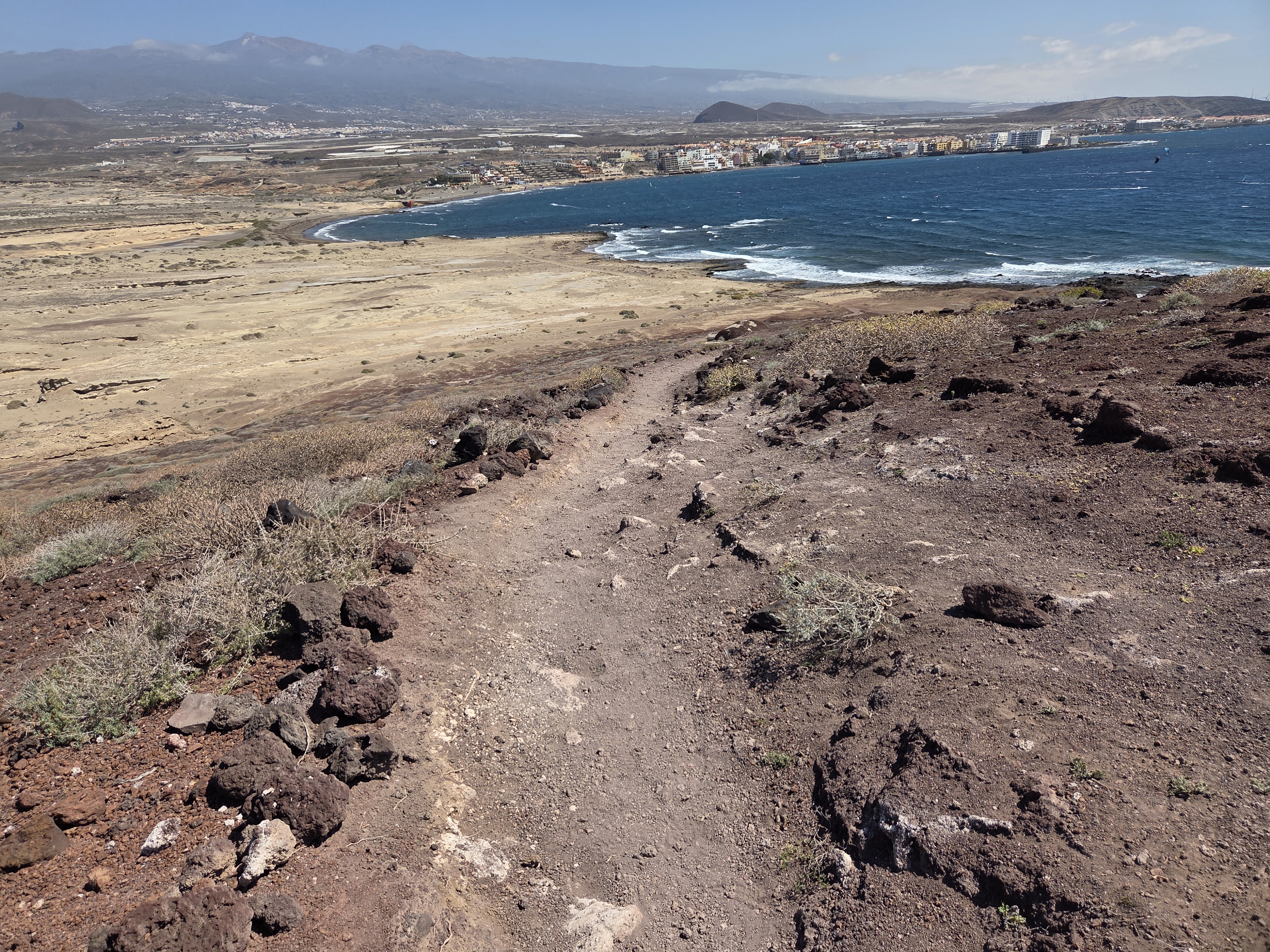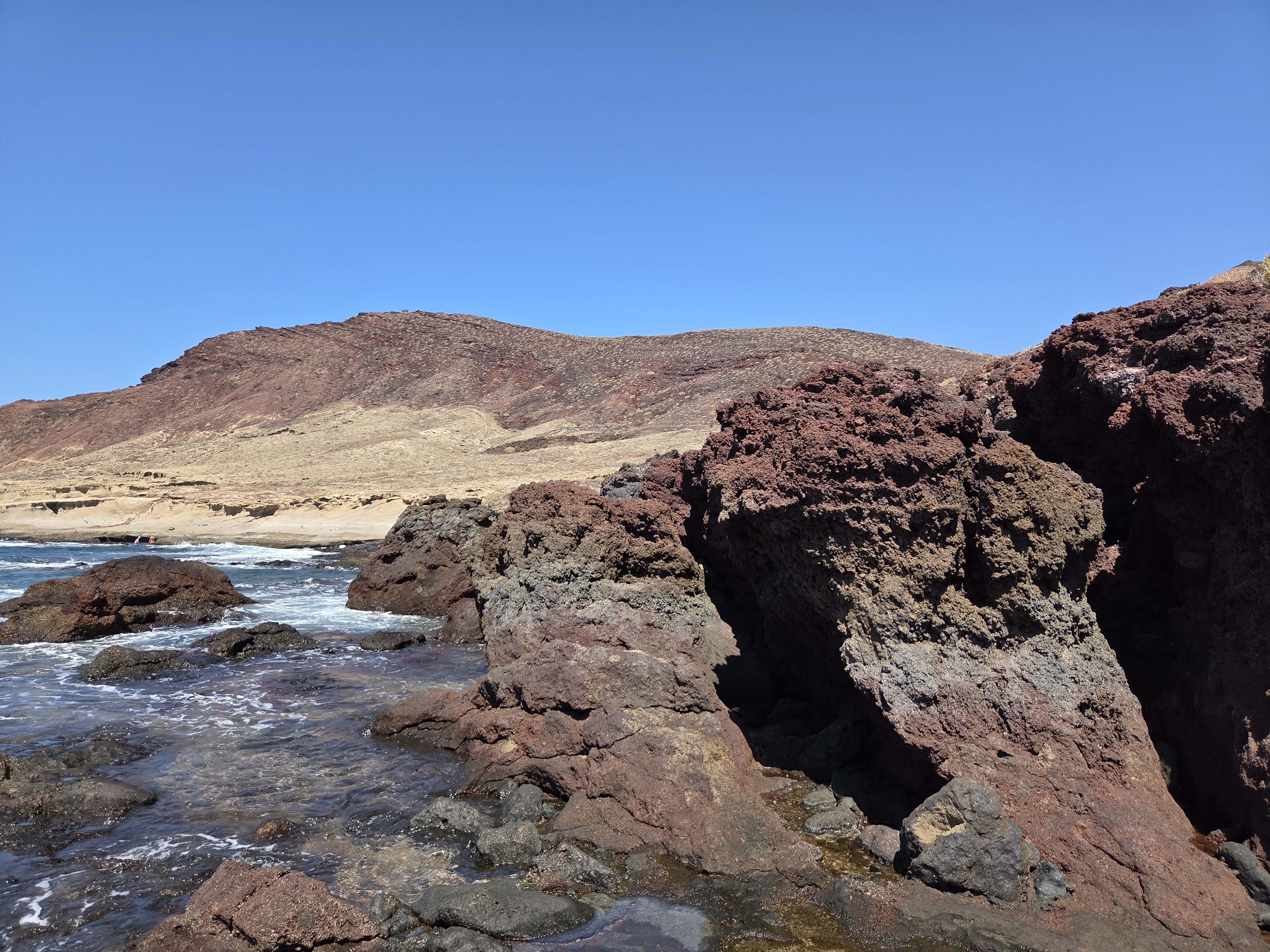 Desde la franja costera se reconoce enseguida el carácter árido y volcánico del entorno. El terreno es cómodo pero pedregoso y conviene llevar calzado con suela firme; en días ventosos, una gorra o pañuelo ayuda bastante.