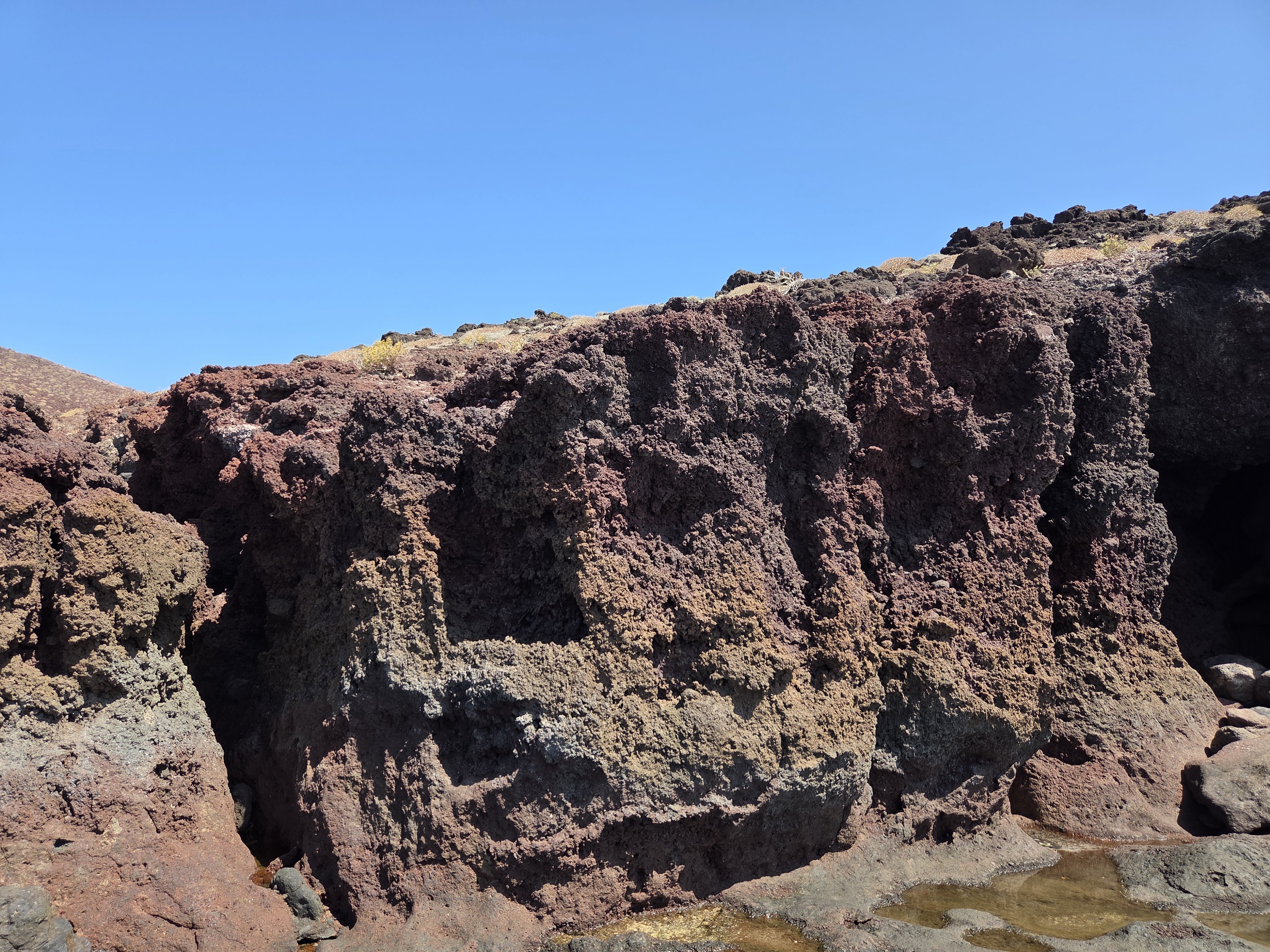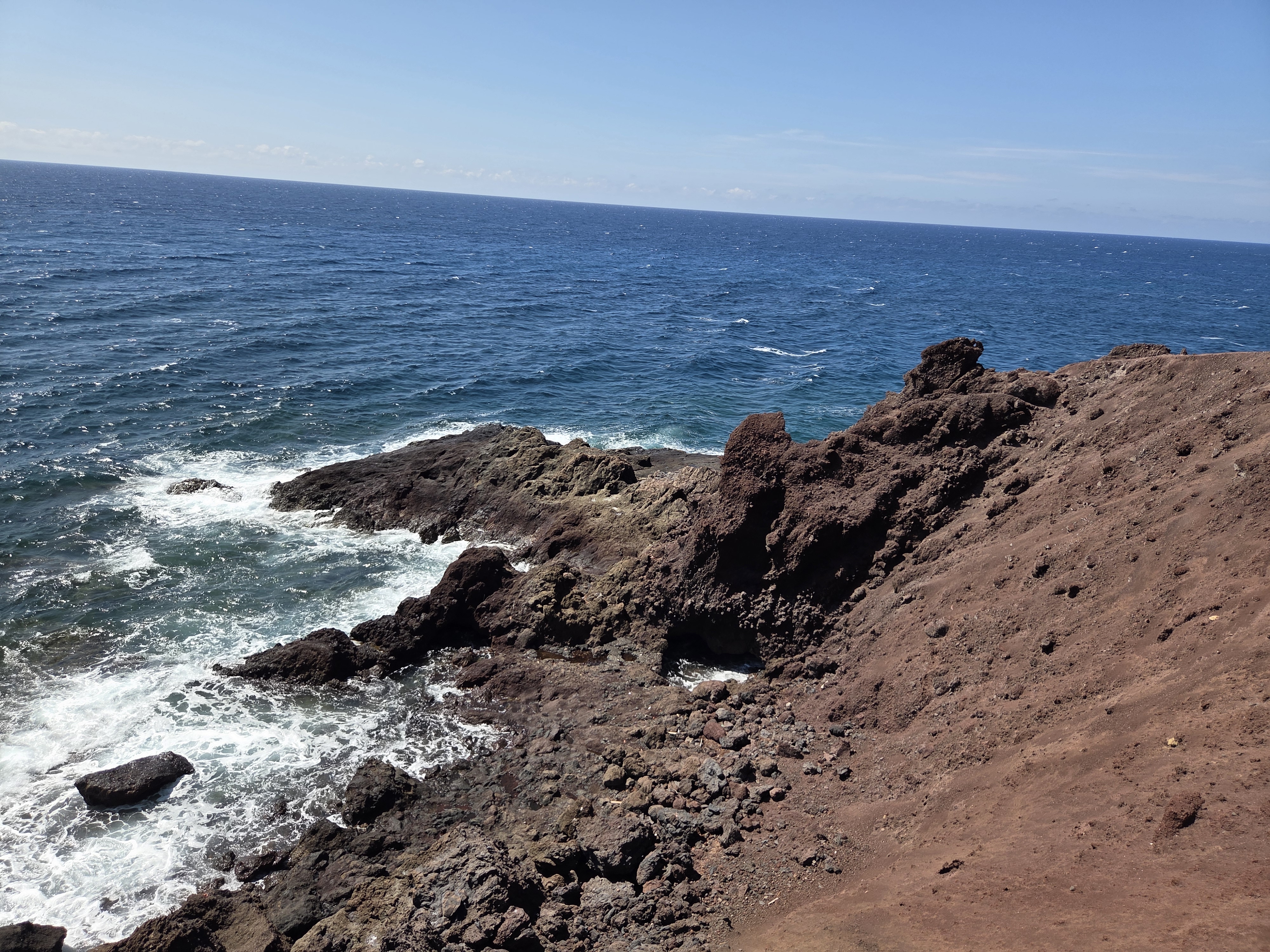 El borde costero alterna plataformas de lava y cortados de poca altura. En pleamar algunas pozas se llenan de agua transparente y funcionan como espejos del cielo.