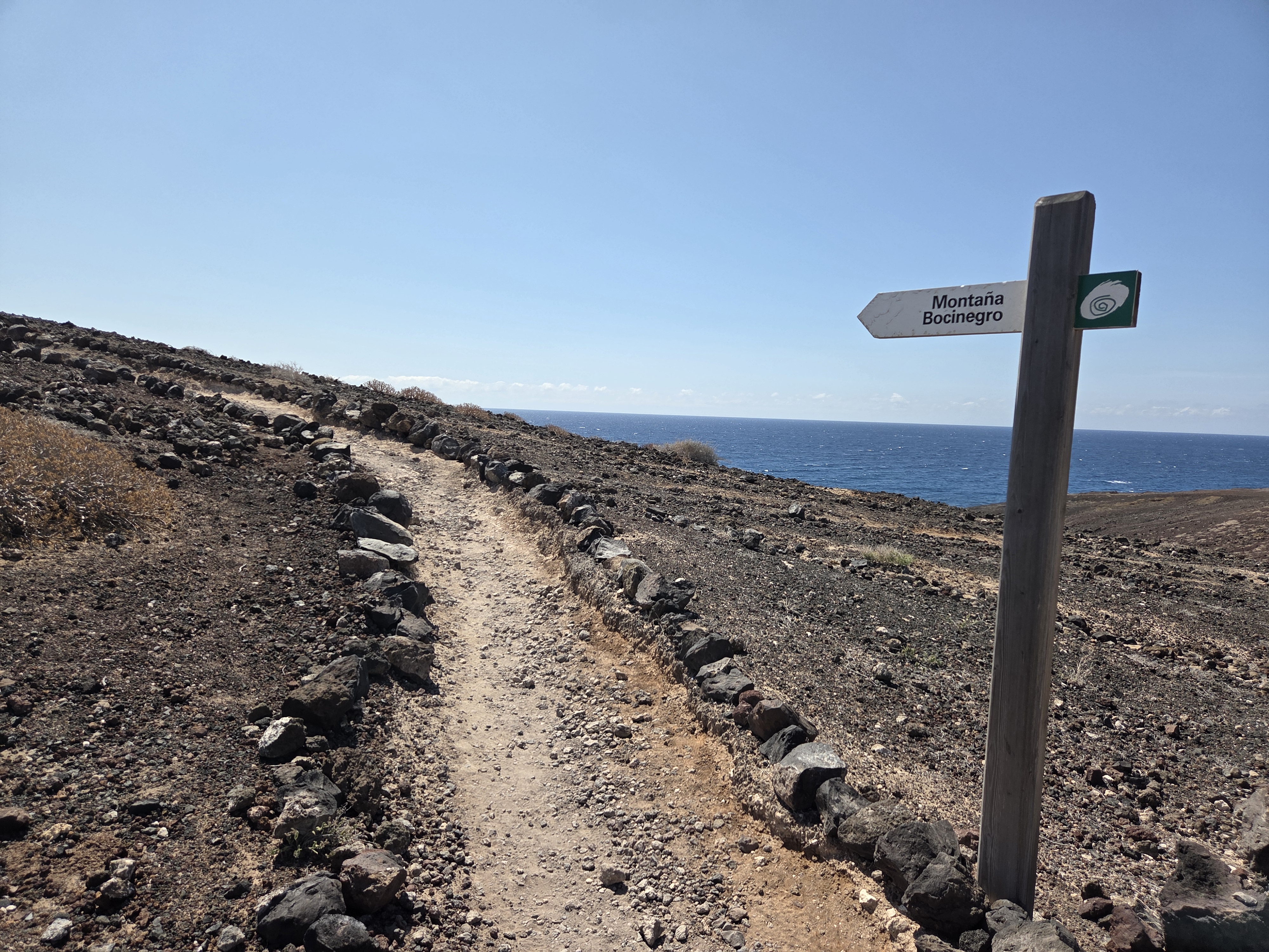 La señalización confirma que vamos en la dirección correcta. A partir de aquí el sendero gana altura poco a poco y aparecen tramos con piedra volcánica suelta.