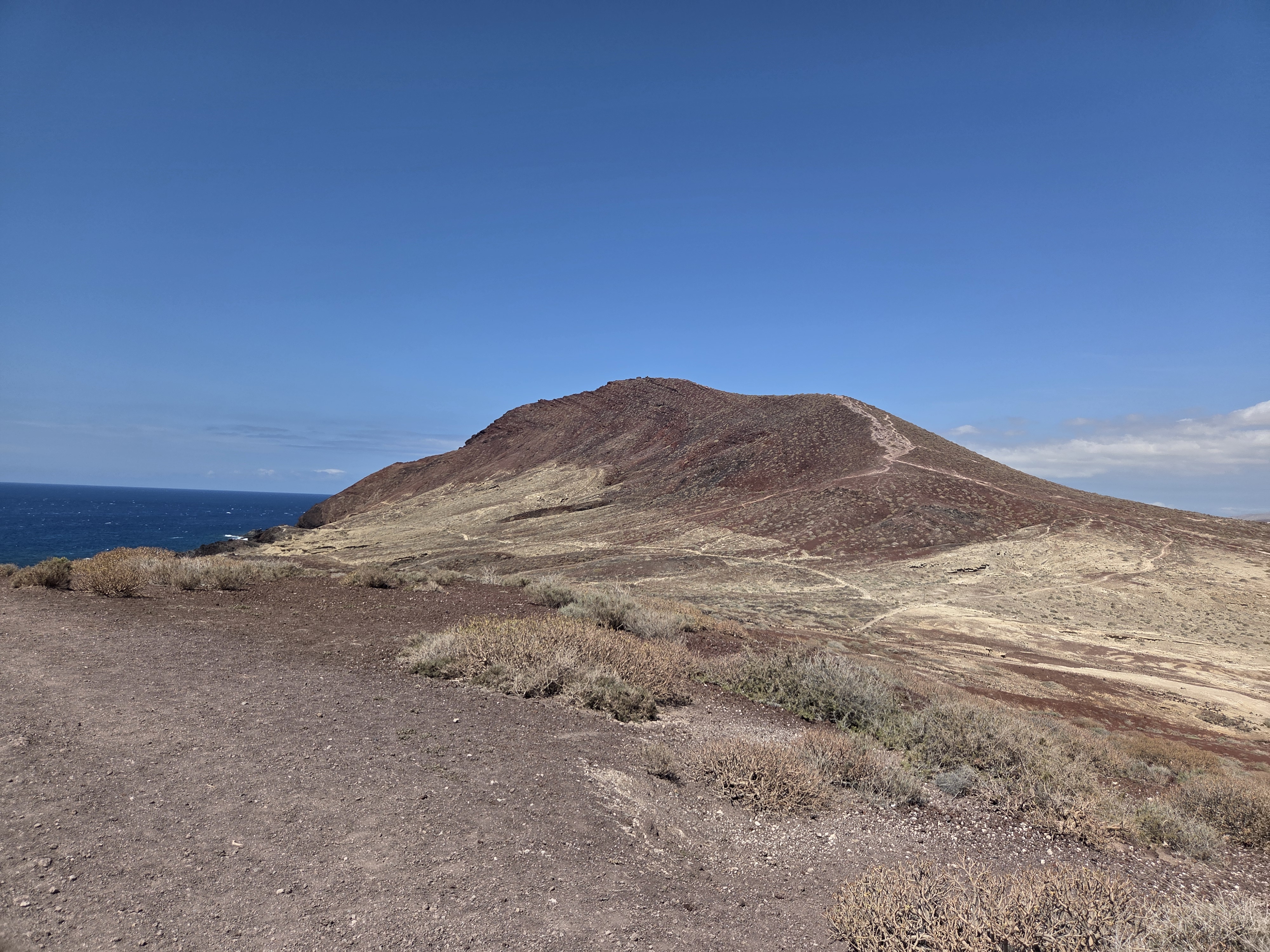 A medida que ascendemos, el sendero dibuja curvas suaves y permite detenerse en pequeños miradores naturales para disfrutar del contraste entre el rojo de la roca y el azul del océano.