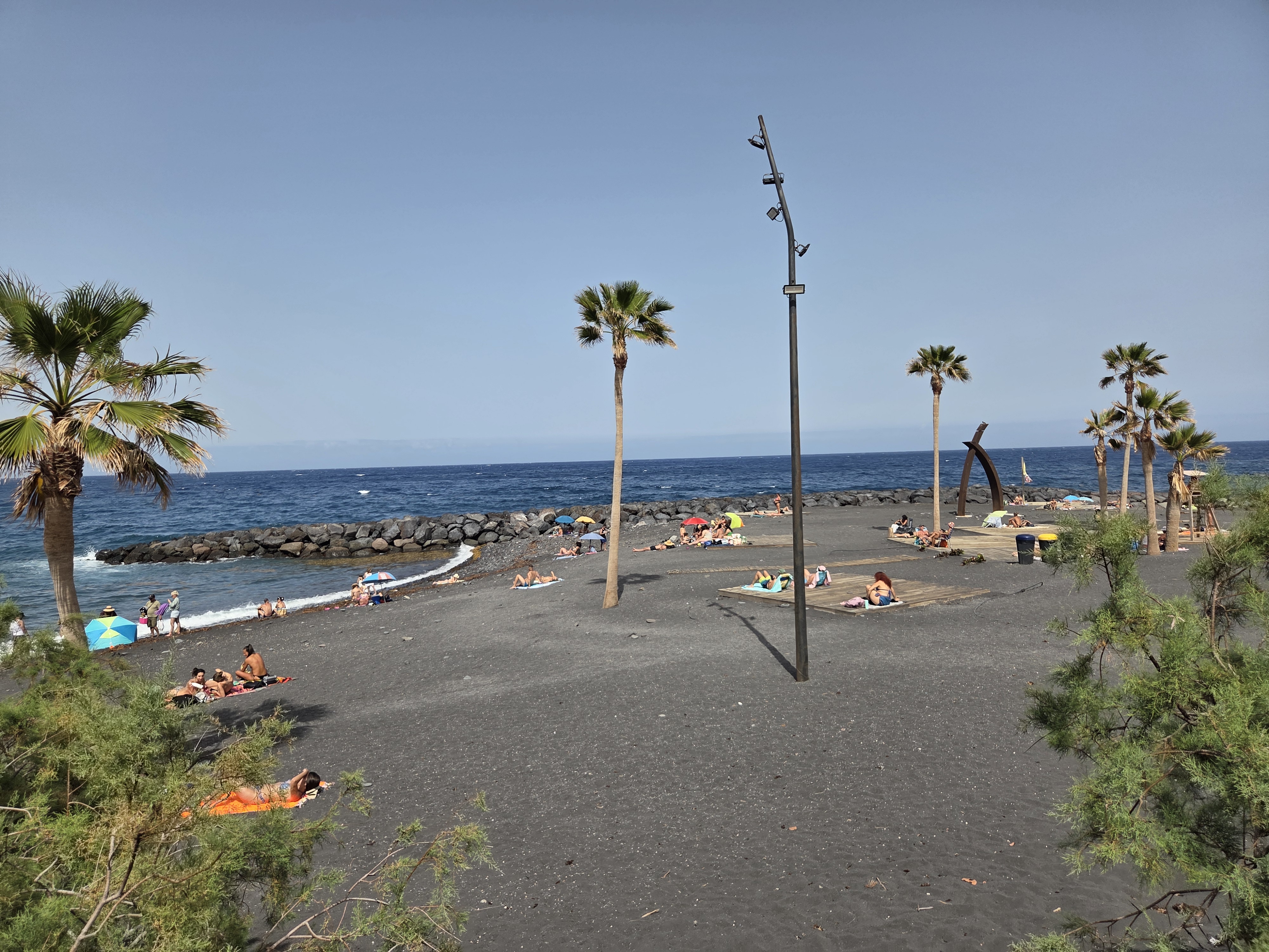 La arena oscura, típica de origen volcánico, se combina con superficies de madera para tumbarse cómodamente. Los espigones laterales reducen el oleaje y forman pequeñas piscinas naturales ideales para familias.