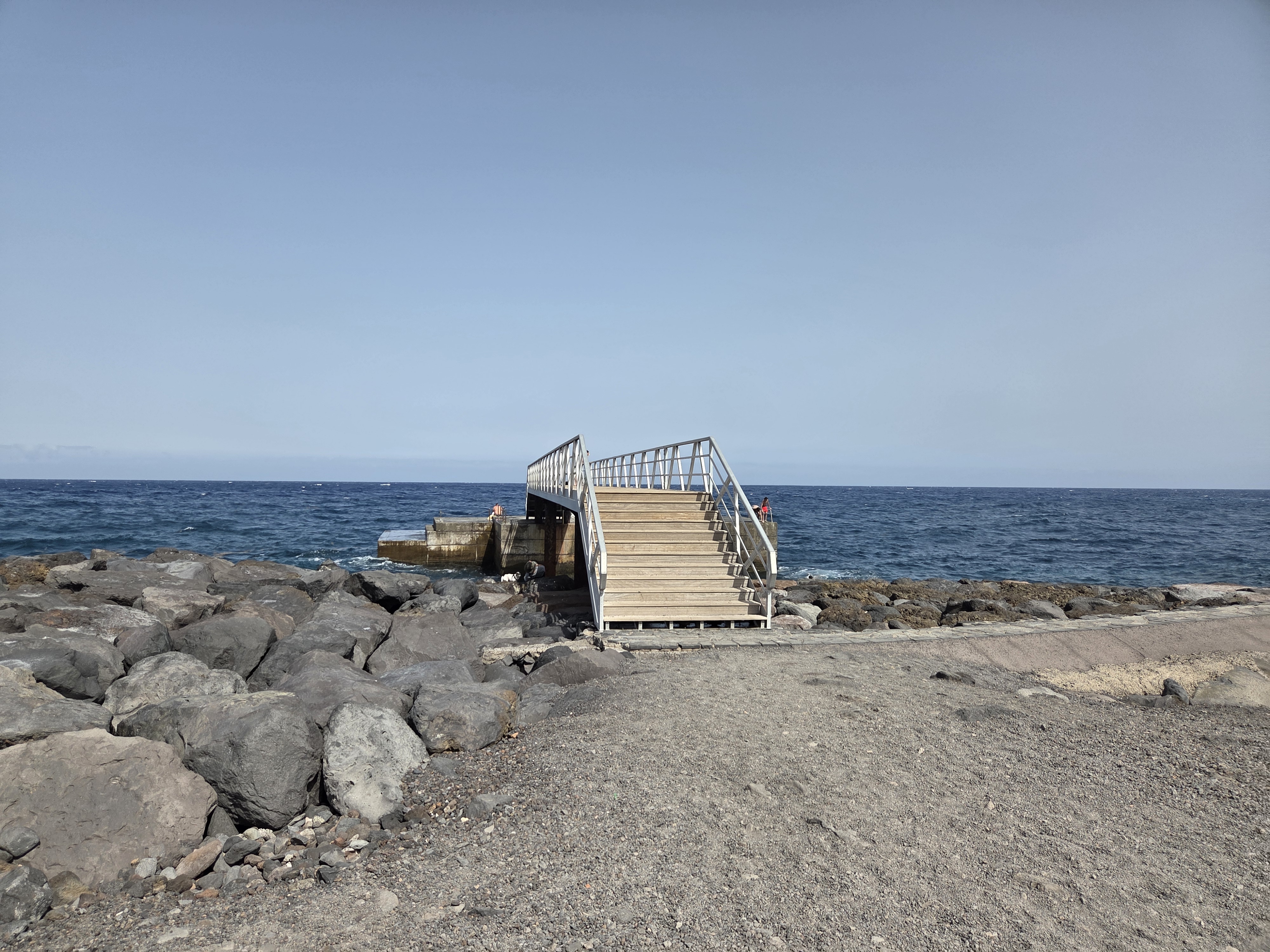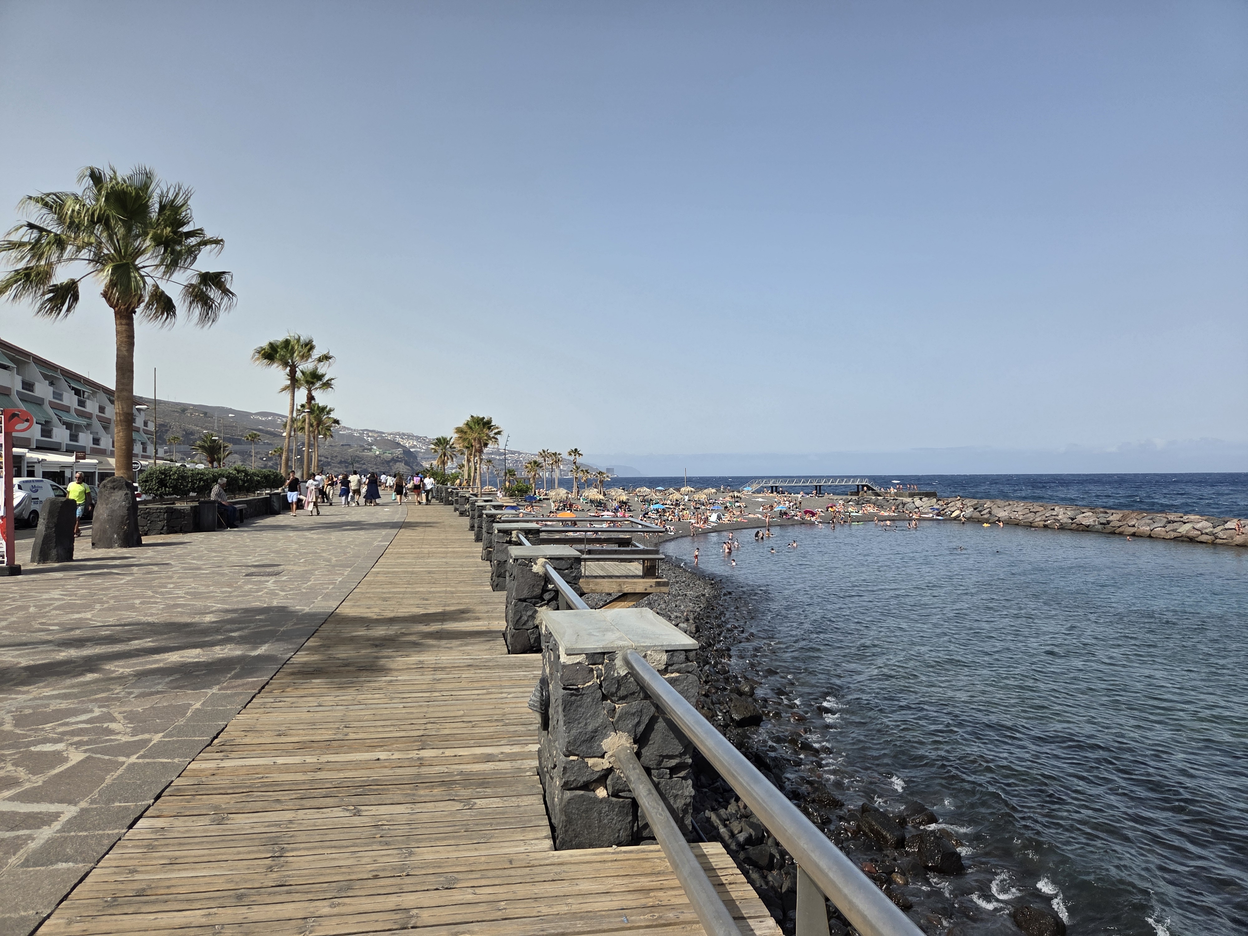 El paseo es llano, cómodo y accesible, ideal para caminar, correr suave o simplemente disfrutar de la brisa marina. La tarima de madera y la piedra volcánica del entorno aportan un carácter muy canario al conjunto.